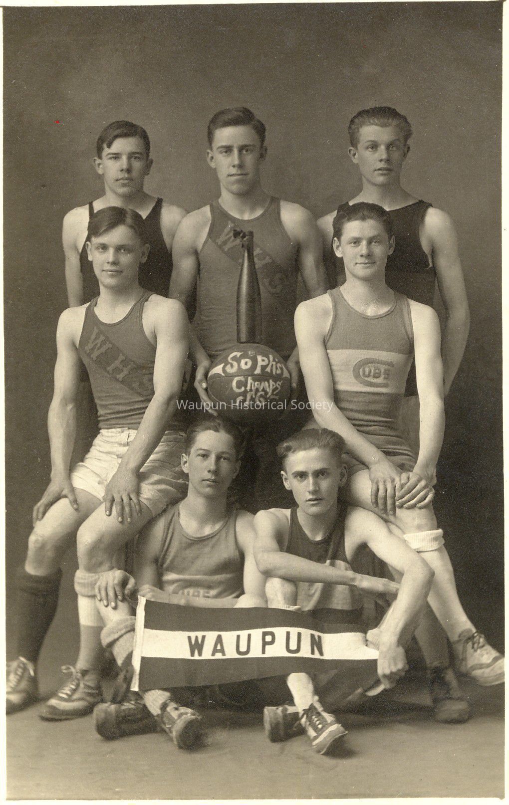 Postcard, P. 69 from collection of Leona Nagler. Appears to be the Waupun Sophmore Basketball team of 1916. As indicated on back of photo, the team is as follows: upper row; Stanley Mashek, Bernard Boudry, and Lester Weilke. Middle row; Elmer Luck, and Aaron Hadfield. Bottom row; Sam Darling, and Eugene Rood. This is a photo Post Card. The basketball has Soph's Champs written on it, also.Acquisition