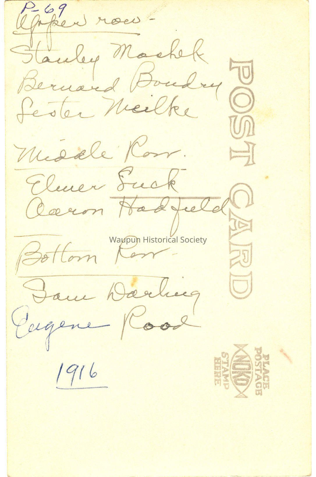 Postcard, P. 69, Waupun Sophomore Basketball Team 1916, Mashek, Boudry, Weilke, Luck, Hadfield, Darling, RoodEntry/Object ID