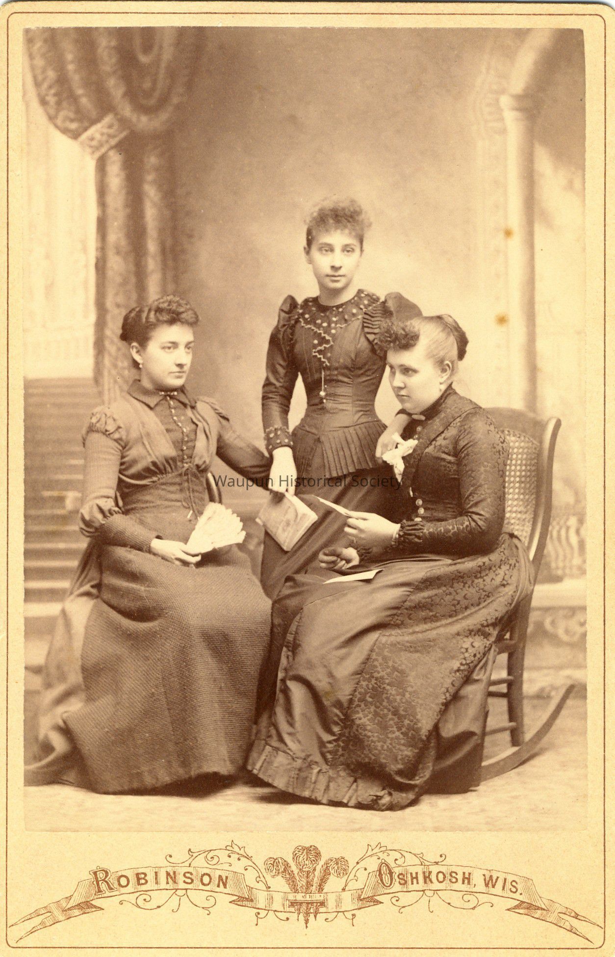 Portrait, P. 70 from collection of Leona Nagler. We believe this to be Mrs. Mattie Stickels Gunnison (woman sitting in the rocker), a well known Waupun woman. There are 2 other women in photo, but their names are unknown.Acquisition