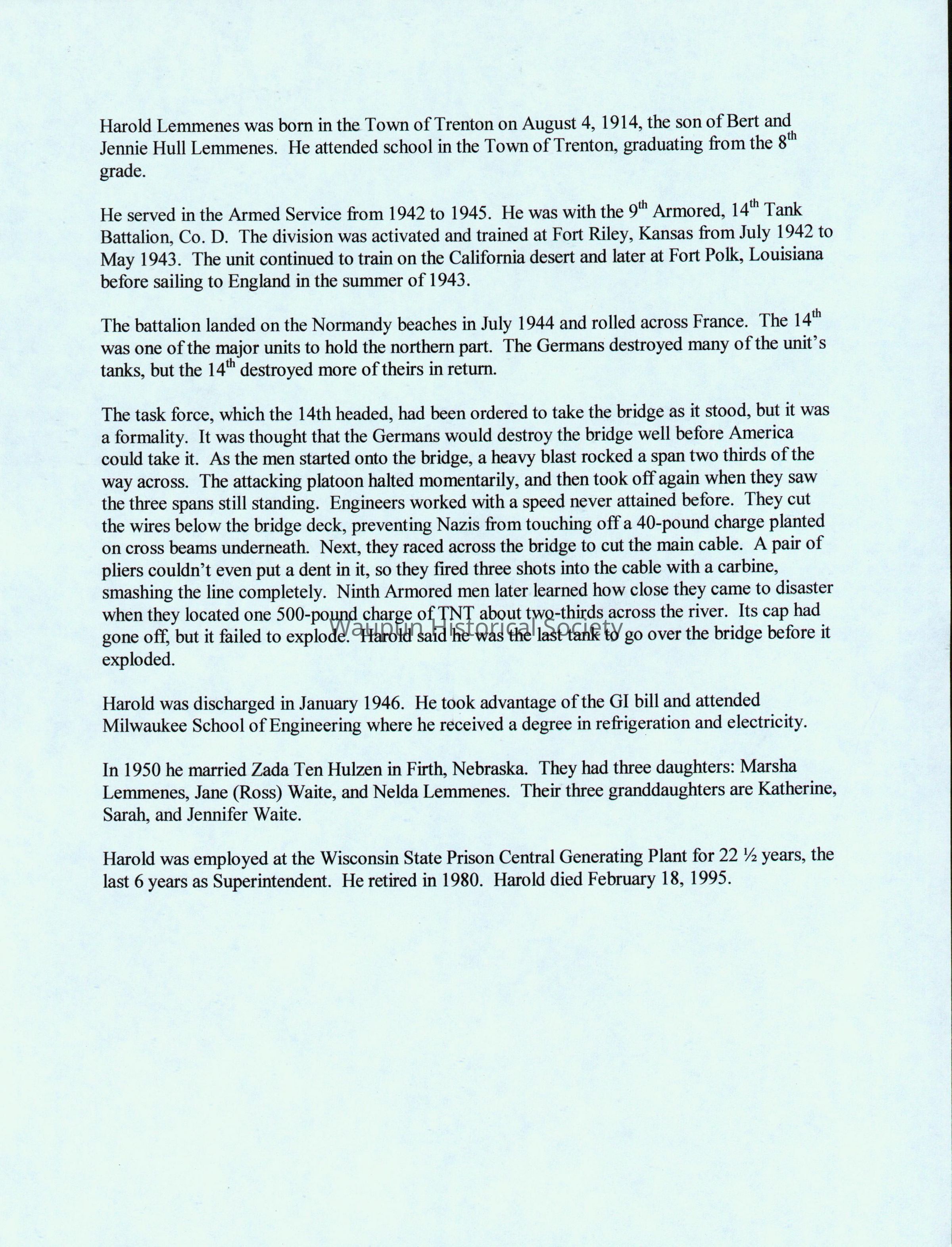 This autobiographical account of Mr. Harold Lemmens life was included in the collection given to the Waupun Heritage Museum by his wife Zada (Ten Hulzen) Lemmenes.Acquisition