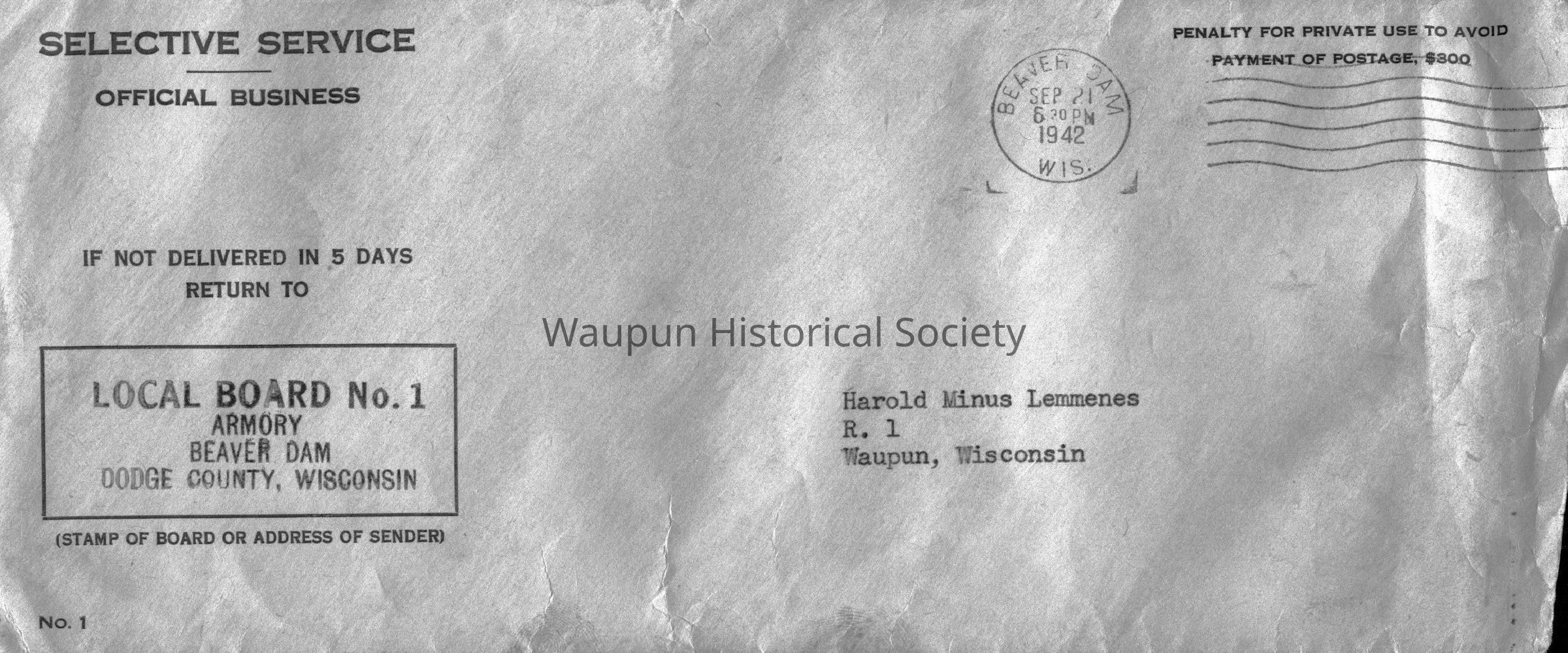 Envelope the of "Order to Report for Induction" sent to Harold Lemmenes on 9/21/1942.Acquisition