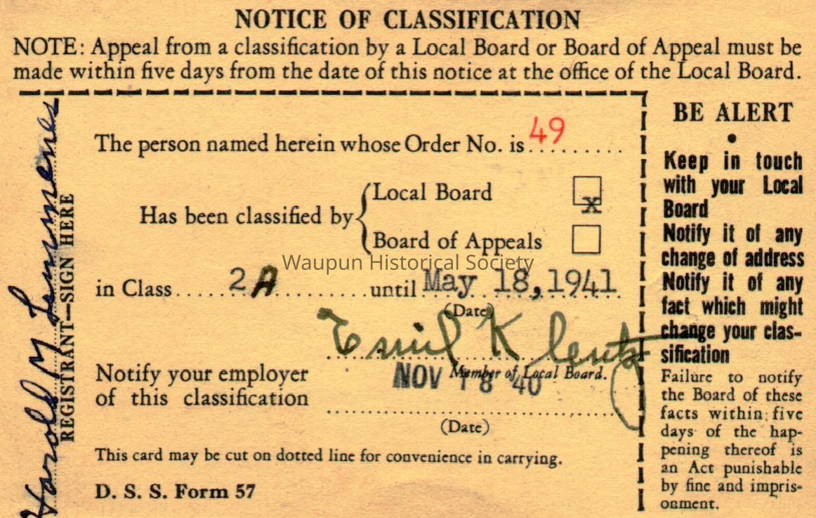 "Notice of Classification" 2-A sent to Harold Lemmens on November 18, 1940Acquisition