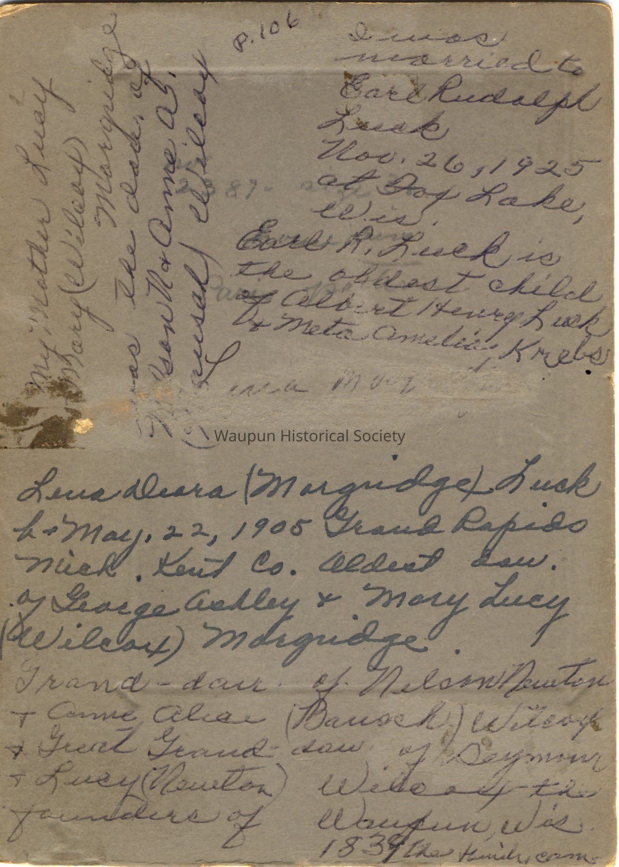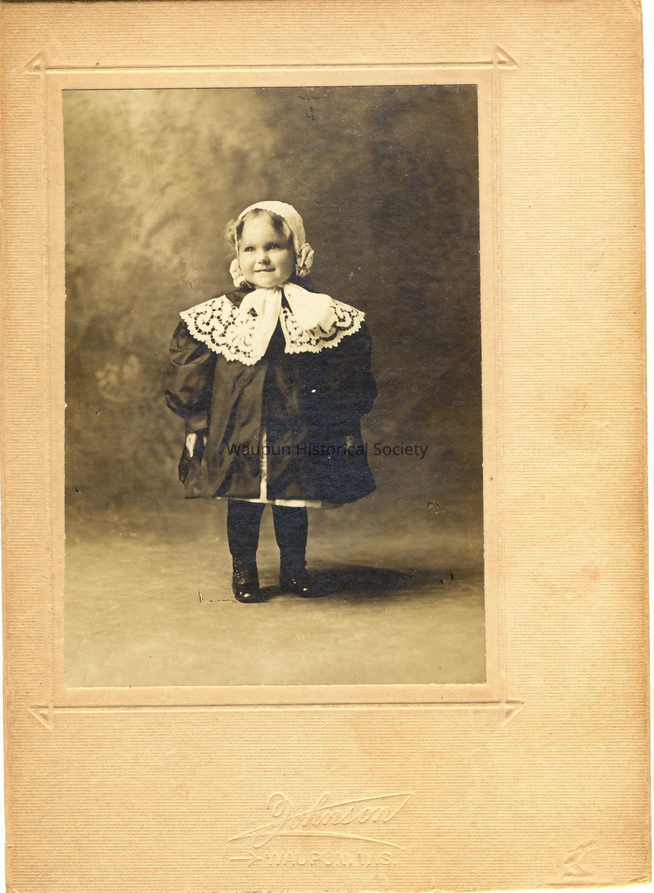 Portrait, Johnson, P. 106 from collection of Leona Nagler. As written on back of photo this is believed to be Lena Deora (Morgridge) Luck, born May 22, 1905, Grand Rapids, Michigan, Kent County. She was the oldest daughter of George Ashley & Mary Lucy (Wilcox) Morgridge. She was married to Earl Rudolph Luck, November 26, 1925 at Fox Lake, Wisconsin. Earl R. Luck was the oldest child of Albert Henry Luck & Meta Amelia Krebs. Lena was the grand daughter of Nelson Newton & Anne Alice (Bausch) Wilcox and great grand daughter of Seymour & Lucy (Newton) Wilcox who was the founder of Waupun, Wis. The family moved here in 1939. Lena's mother was Lucy Mary (Wilcox) Morgridge, who was the daughter of Nelson N. & Anne A. (Bausch) Wilcox.Acquisition