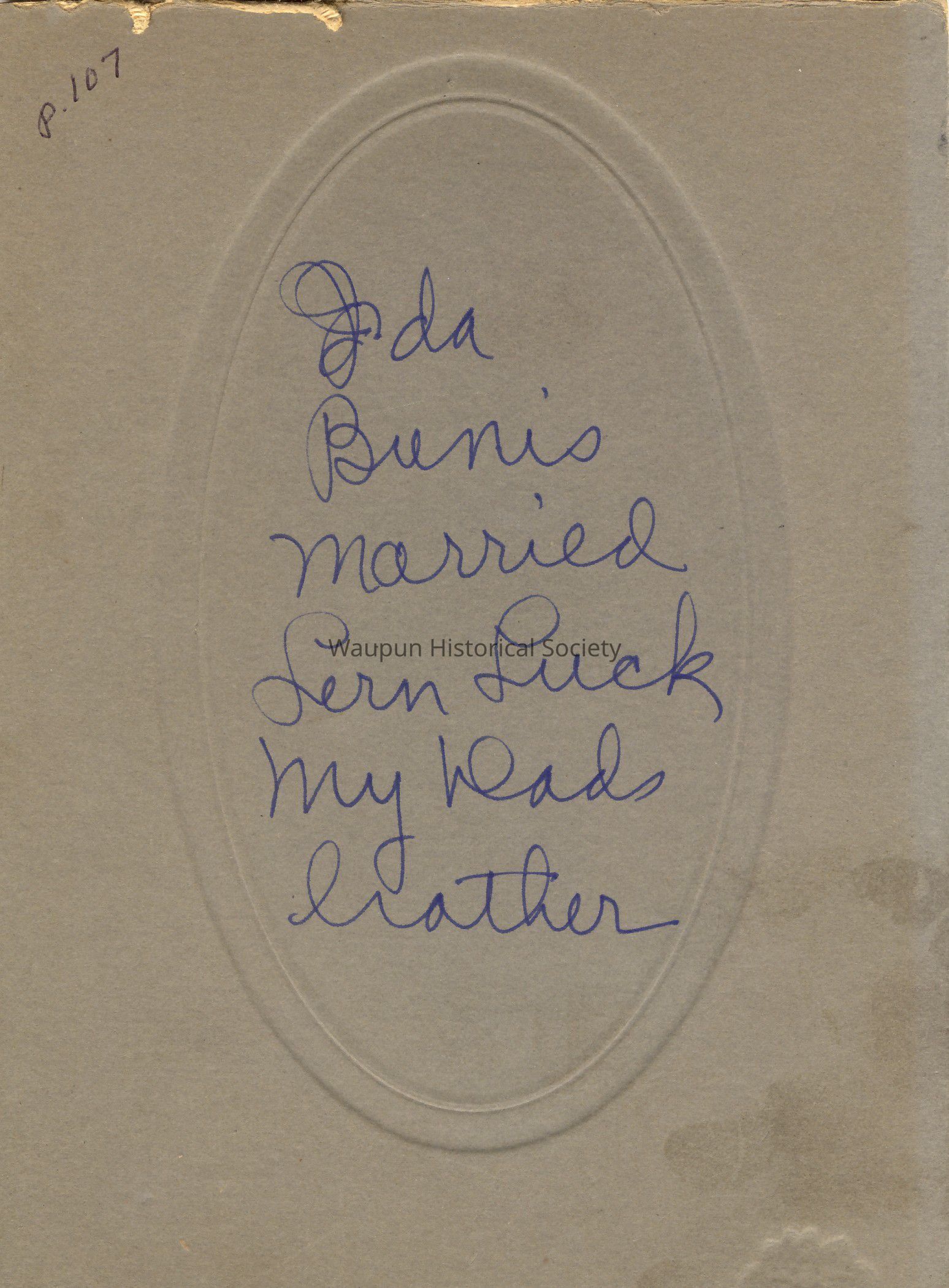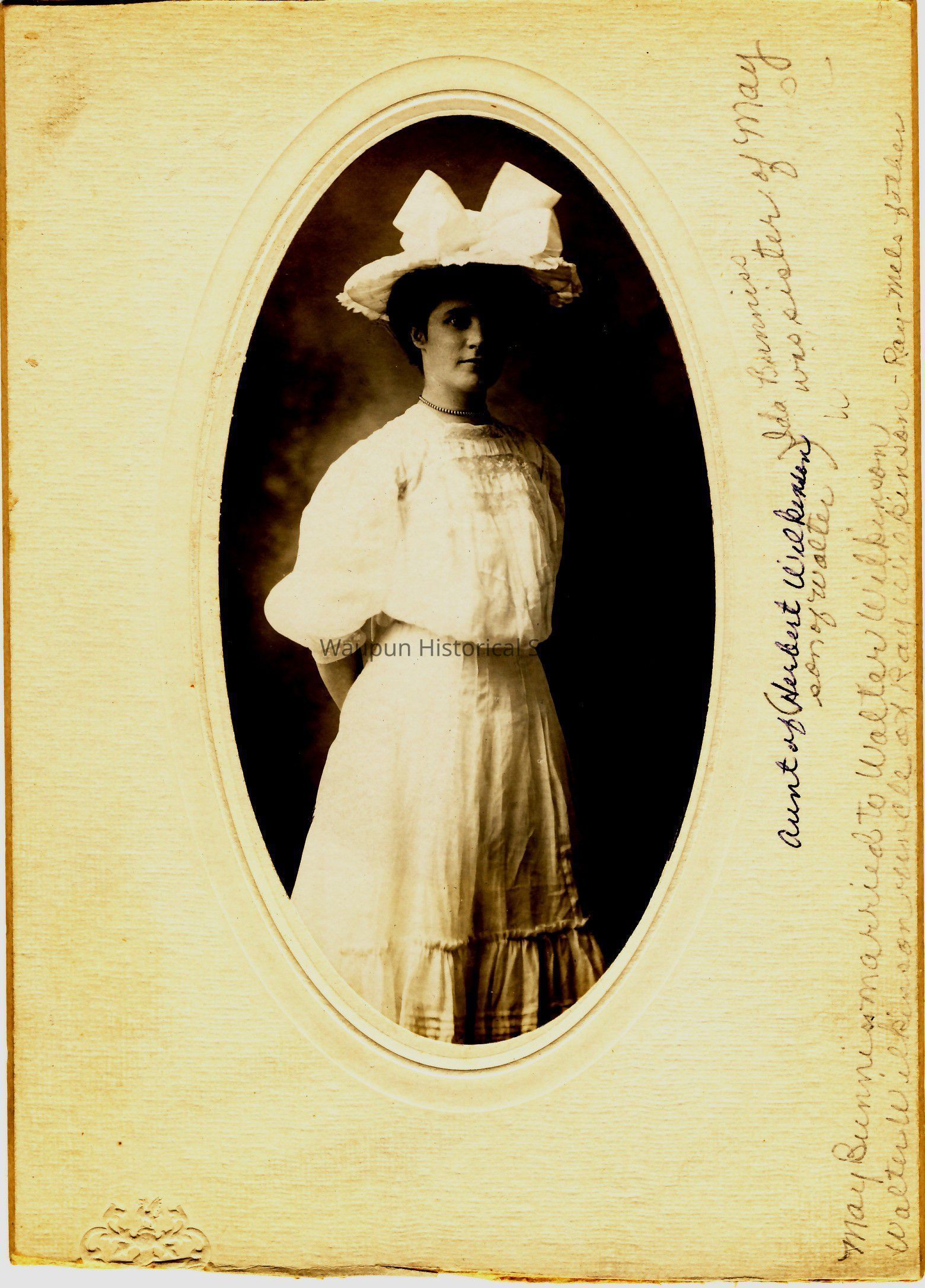 Portrait, P. 107 from collection of Leona Nagler. As written on back and front of photo we believe this to be Ida Bunniss Luck. Was married to Lern Luck. She was sister of May Bunniss who was married to Walter Wilkinson. Walter Wilkinson was the uncle of Ray Wilkinson. Ida was the aunt of Herbert Wilkinson who was the son of Walter Wilkinson.Acquisition