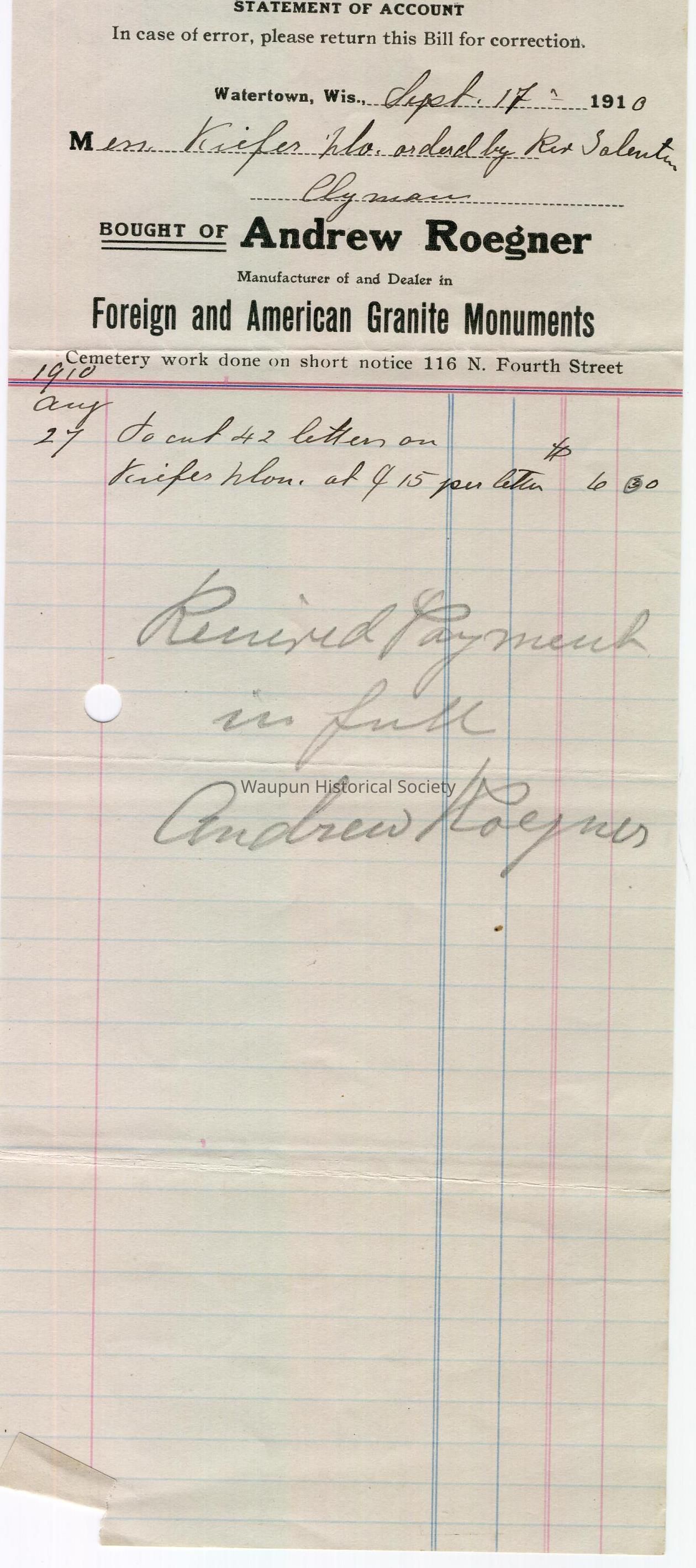 Bought of Andrew Roegner, Manufacturer of and Dealer in Foreign and American Granite Monuments, Cemetery work done on short notice, 116 N. Fourth Street