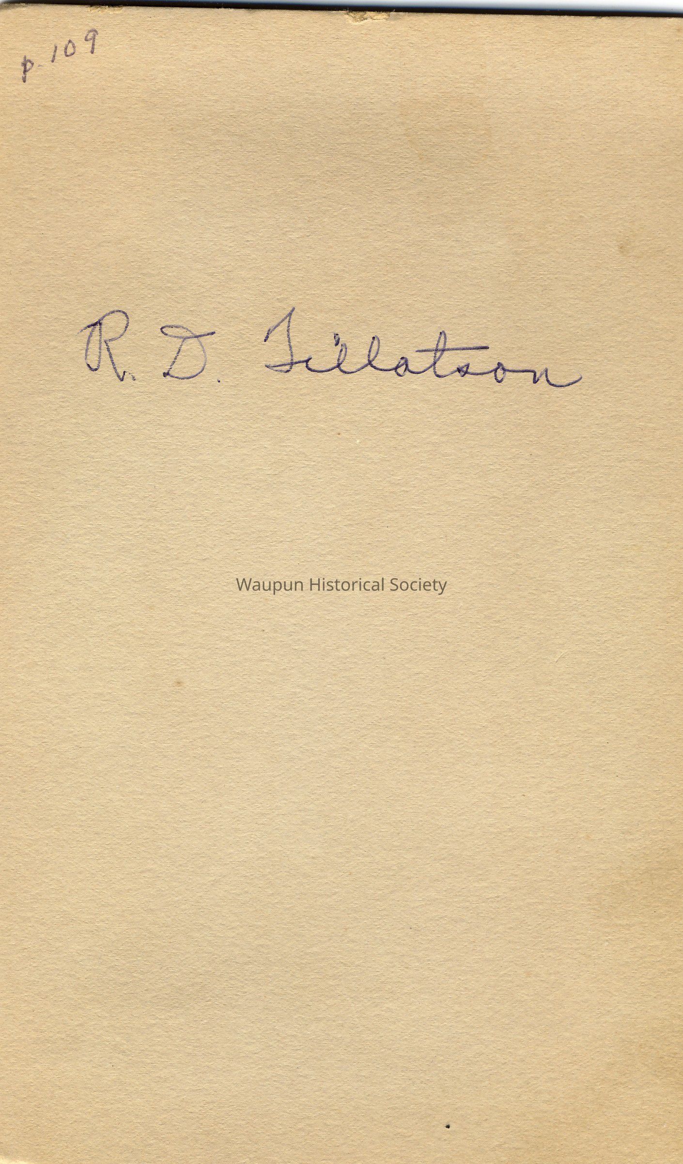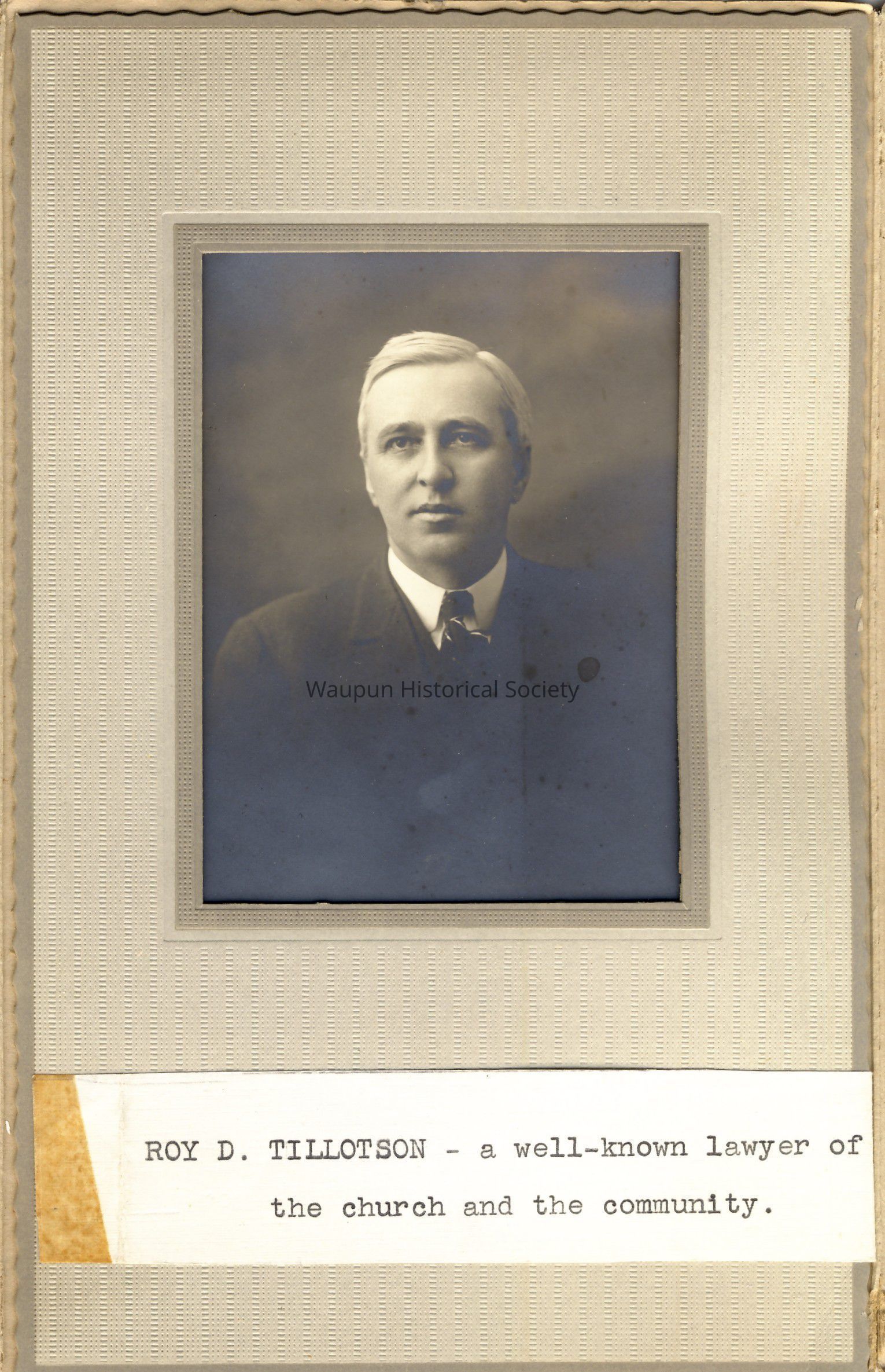 Portrait, P. 109 from collection of Leona Nagler. We believe this to be Roy D. Tillotson, a well-known lawyer of the church and the community.Acquisition