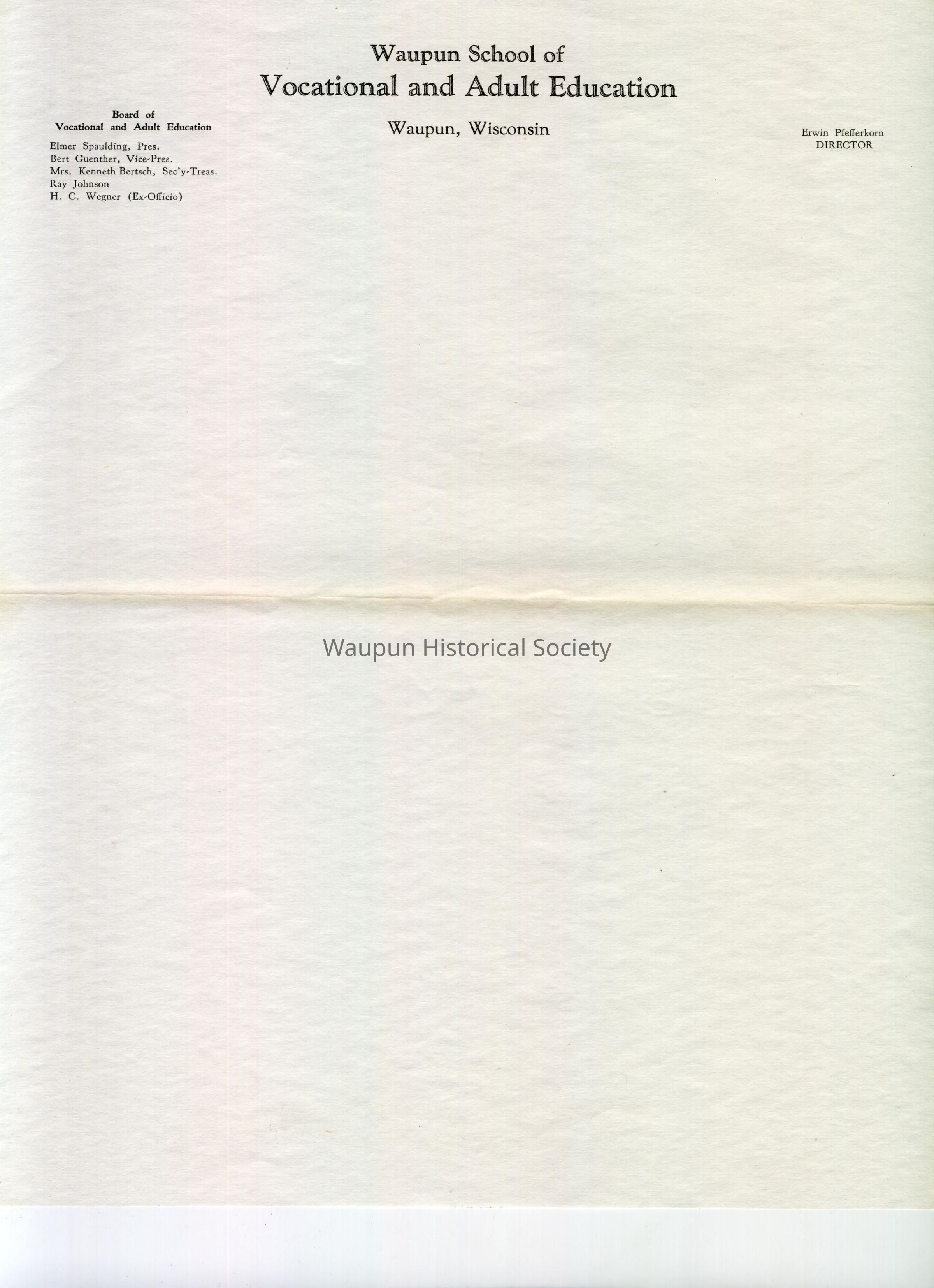 Waupun School of Vocational and Adult Education. This letterhead is 8 1/2" x 11" and has a crease down the center. Board of Vocational and Adult Education: Elmer Spaulding, President; Bert Guenther, Vice-President; Mrs. Kenneth Bertch, Secretary-Treasurer, Ray Johnson, H. C. Wegner (Ex-Officio); Erwin Pfefferkorn, Director.Acquisition