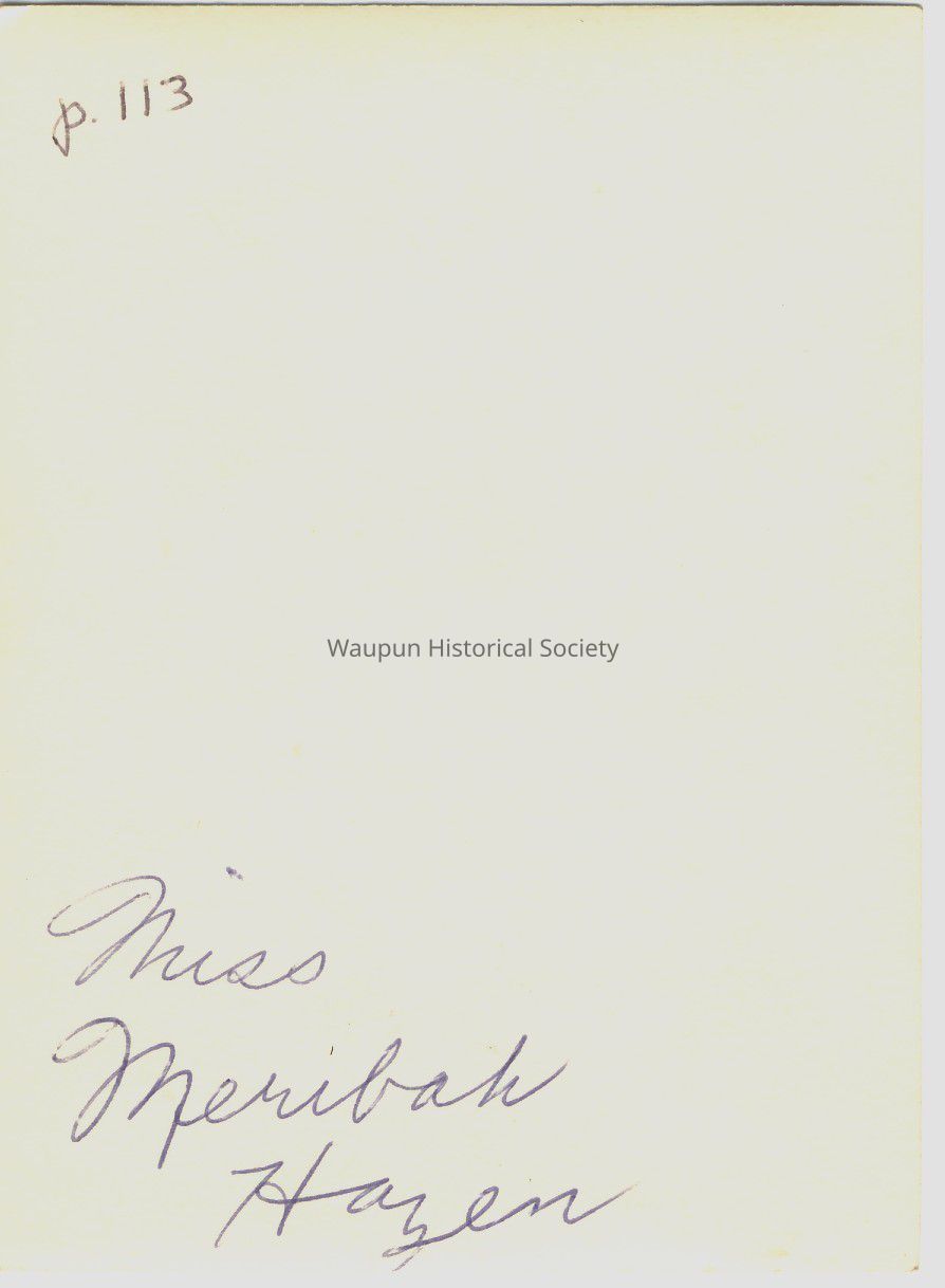 Photograph, P. 113 from collection of Leona Nagler. We believe this to be Miss Meribah Hazen as indicated on back of photo.Acquisition