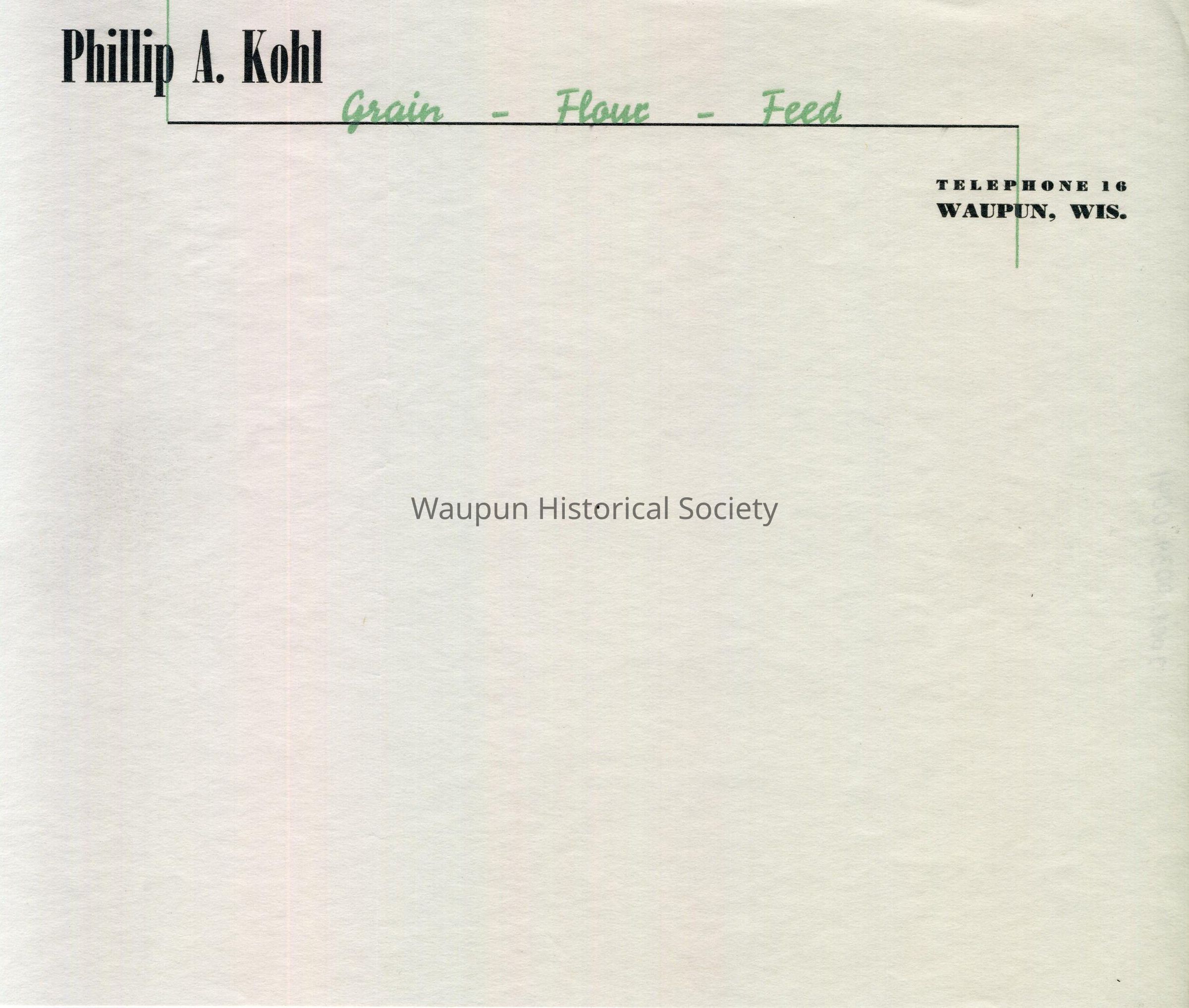 Kohl Elevator. Phillip A. Kohl. Grain - Flour - Feed. Telephone 16, Waupun, Wisconsin. According to 1947 City Directory, Phillip A. Kohl, was proprietor of Kohl Elevator, located at 17 Commercial Street. Wife Loraine, sons Phillip F. and David. Home address 38 Taylor St.Acquisition