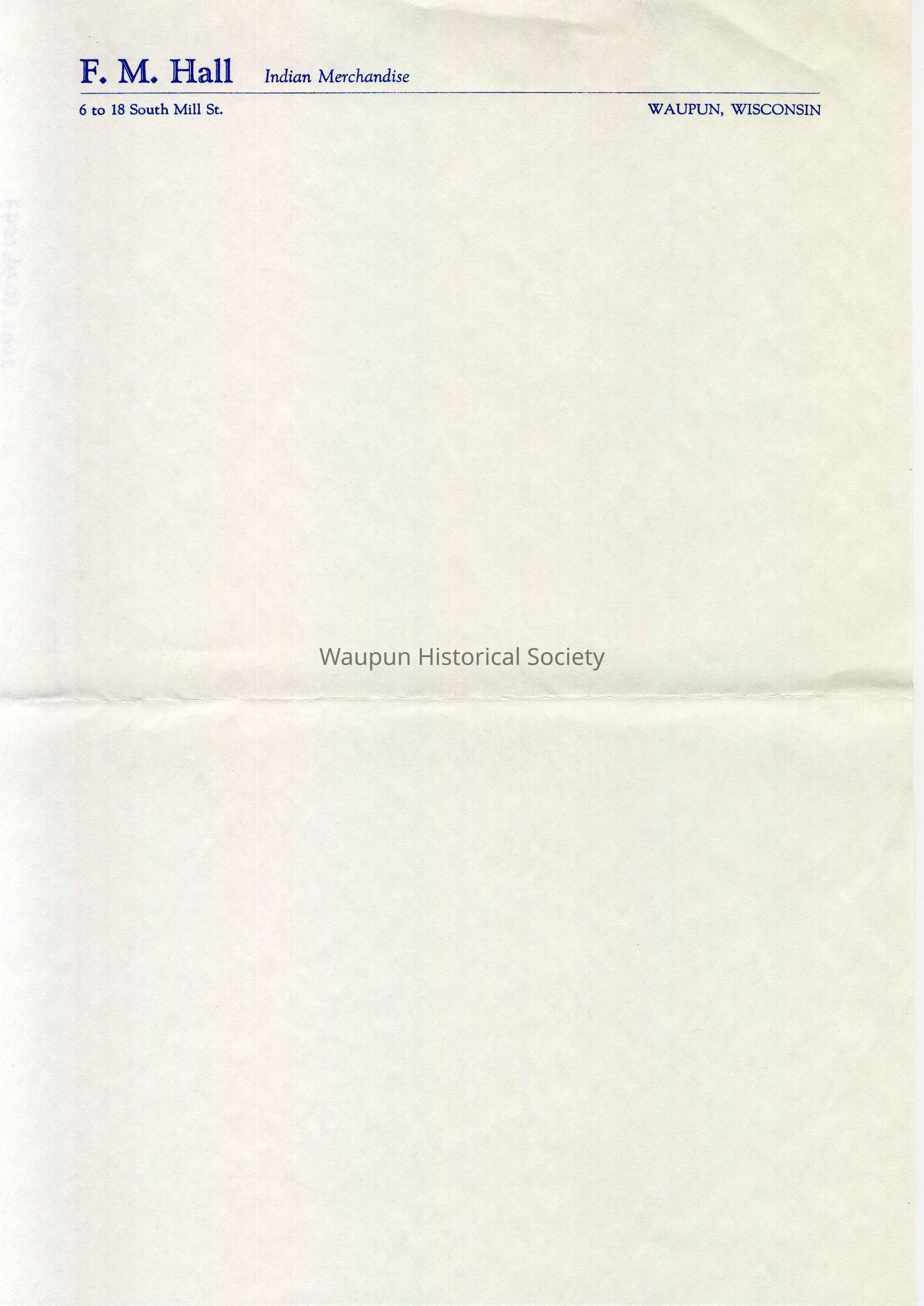 F. M. Hall, Indian Merchandise. Letterhead. 6 to 18 South Mill Street, Waupun, Wisconsin. According to 1947 Waupun City Directory, Frank M. Hall was a salesman of "Indian Goods." Wife Laura Lee Hall. Lived at 18 South Mill.Acquisition