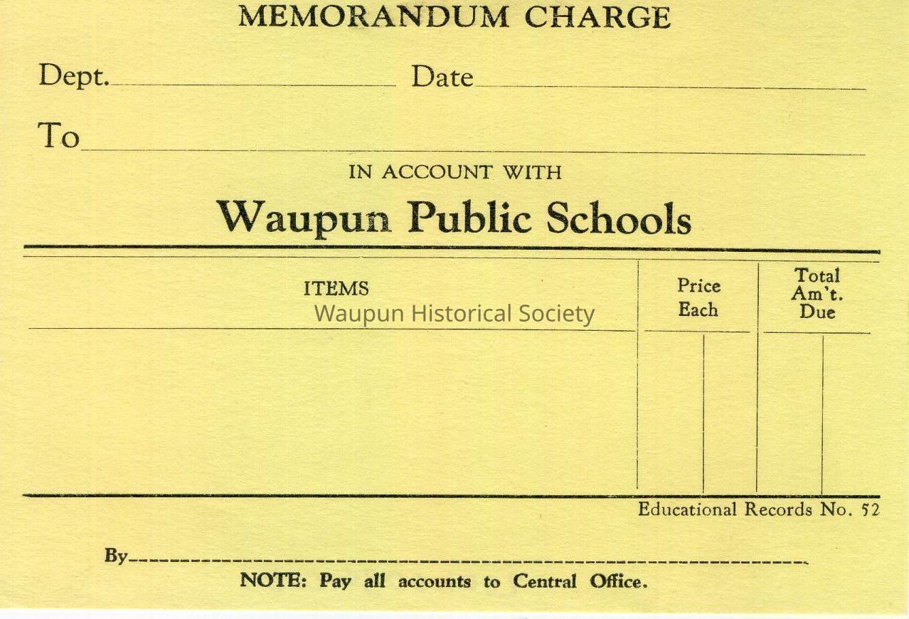 Memorandum Charge In Account with Waupun Public Schools (Note: Pay all accounts to Central Office). No date given.Acquisition