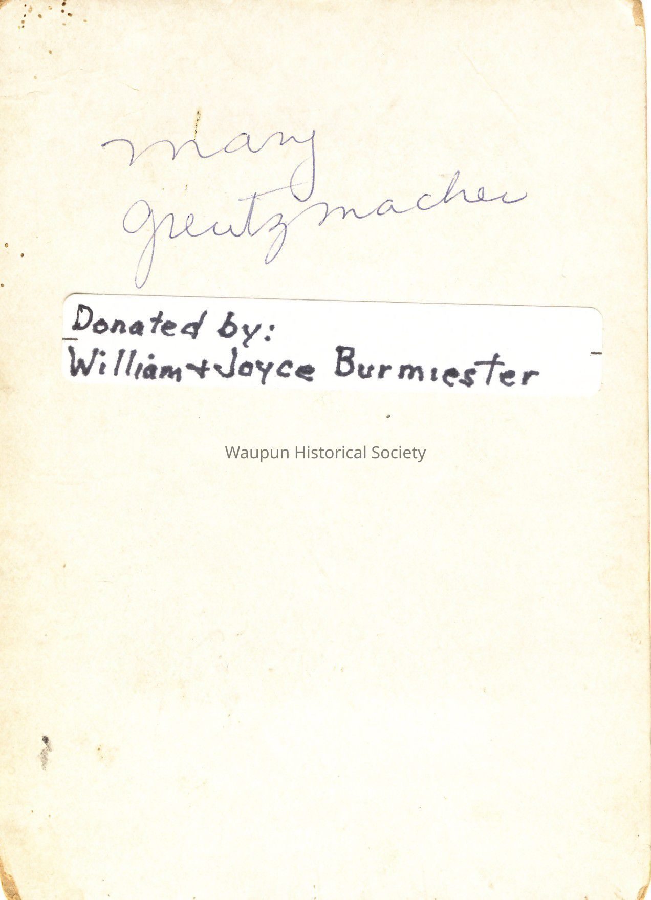 Cabinet Card, Johnson, Photo of Mary Greutzmacher donated by William & Joyce Burmeister. This was in the box from the collection of Leona Nagler.Acquisition