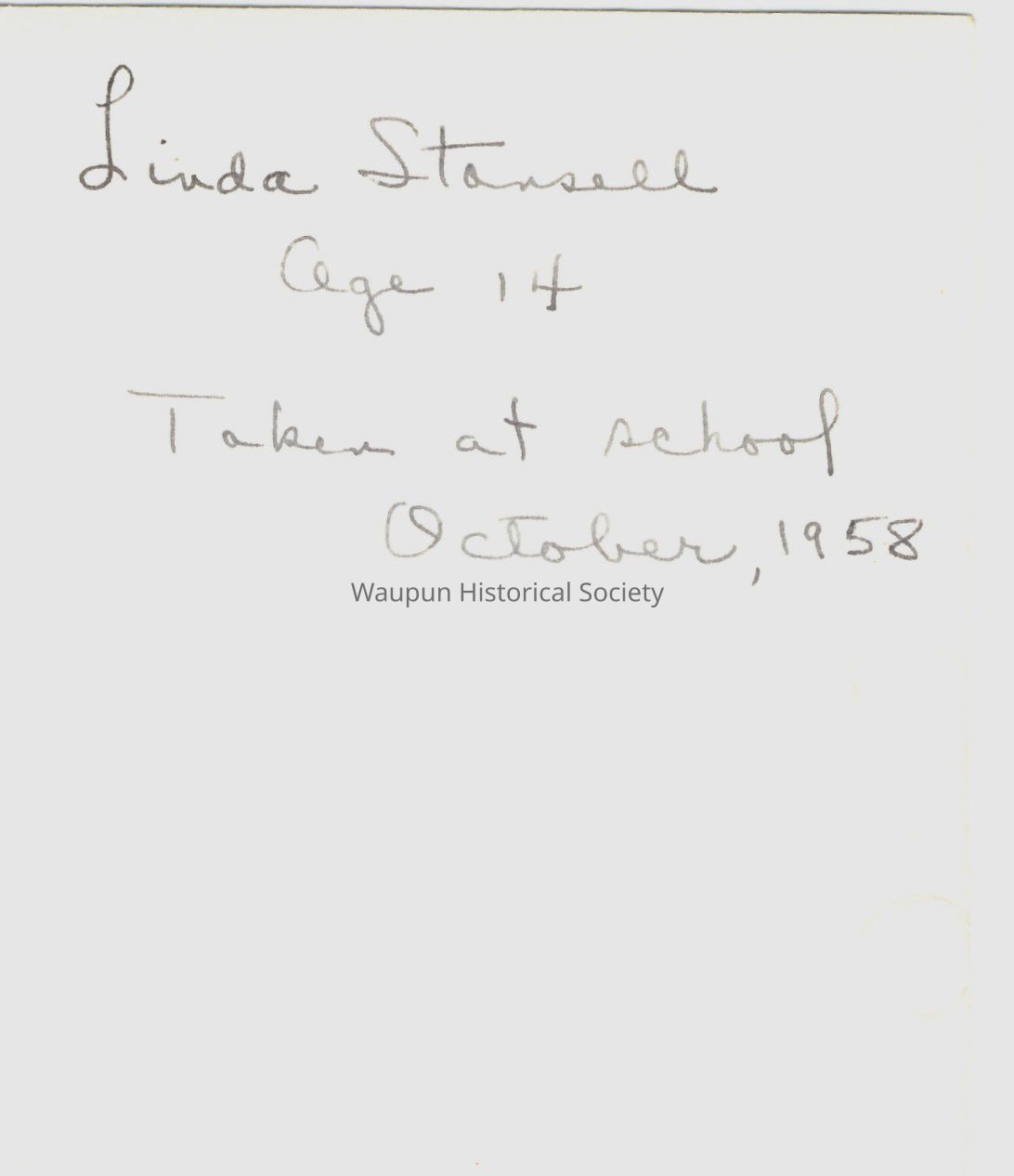 Photograph, We believe this to be Linda Stansell, age 14, taken at school, October 1958. This is from the collection of Leona Nagler.Acquisition