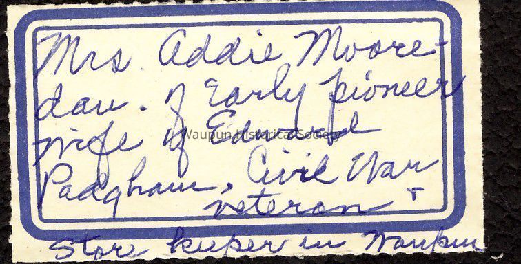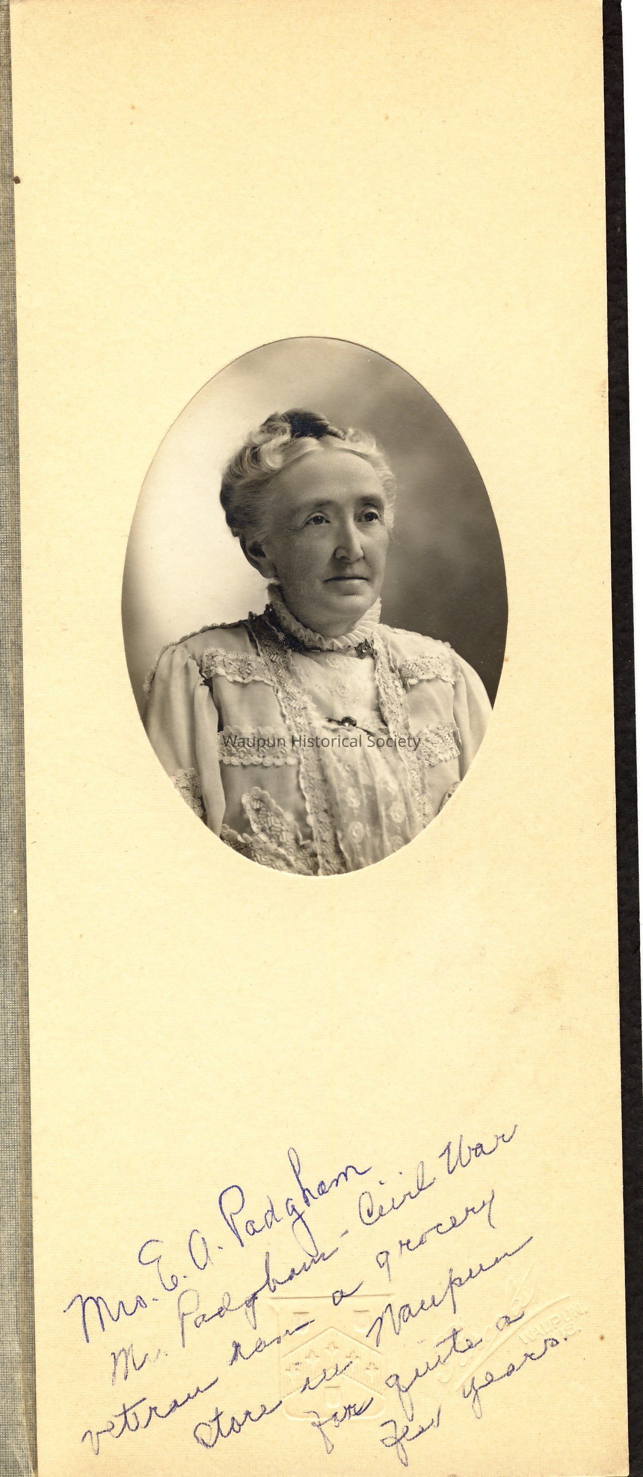 Portrait, Brooks, Photo found in box of collection of Leona Moore. As indicated on back of photo we believe this to be Mrs. Addie Moore, daughter of early pioneer and wife of Edward Padgham; Civil War veteran. Also operated a grocery store in Waupun for quite a few years.Acquisition