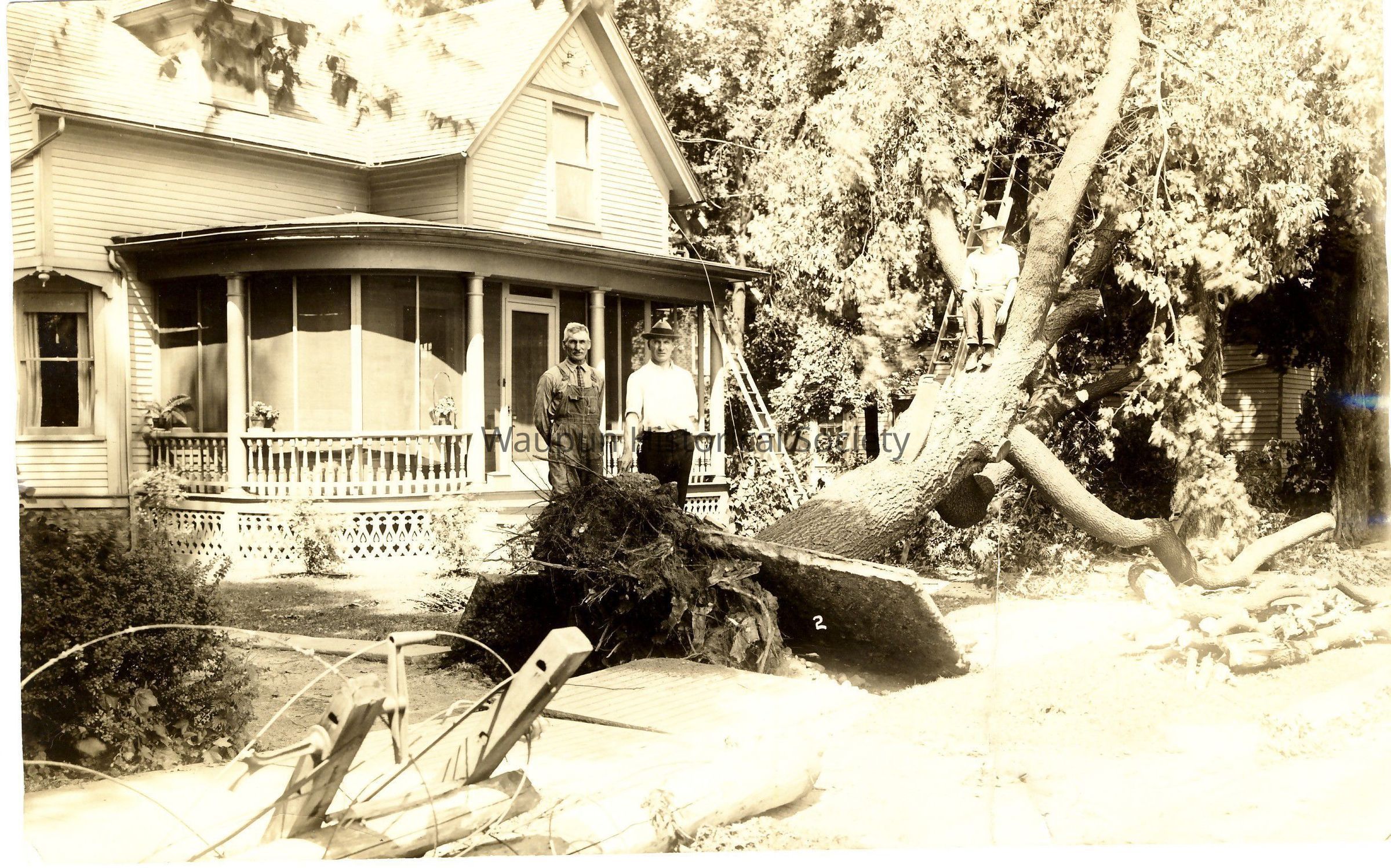 Photograph, Photo in box with collection of Leona Nagler. Indicates on back of photo that this is the Harterink home after the bad wind storm of August 1, 1953. Not sure who the two men are in front of the home or the man sitting in the fallen tree.Acquisition