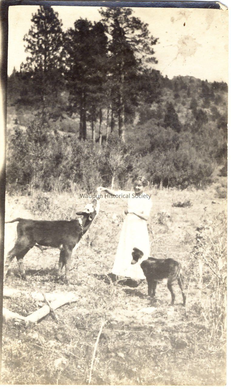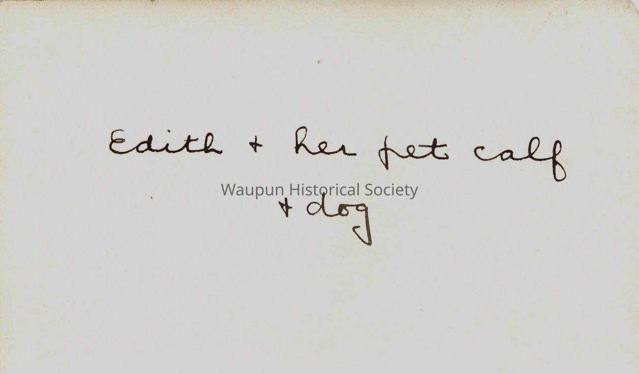 Photograph, from box with collection of Leona Nagler. Back of photo indicates that this is Edith and her pet calf and dog.Acquisition