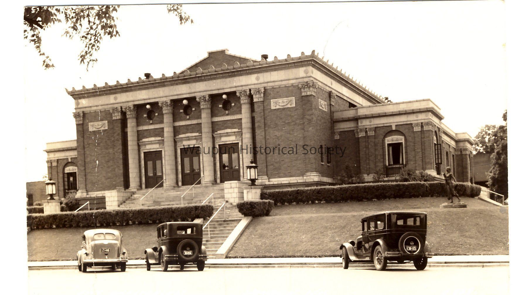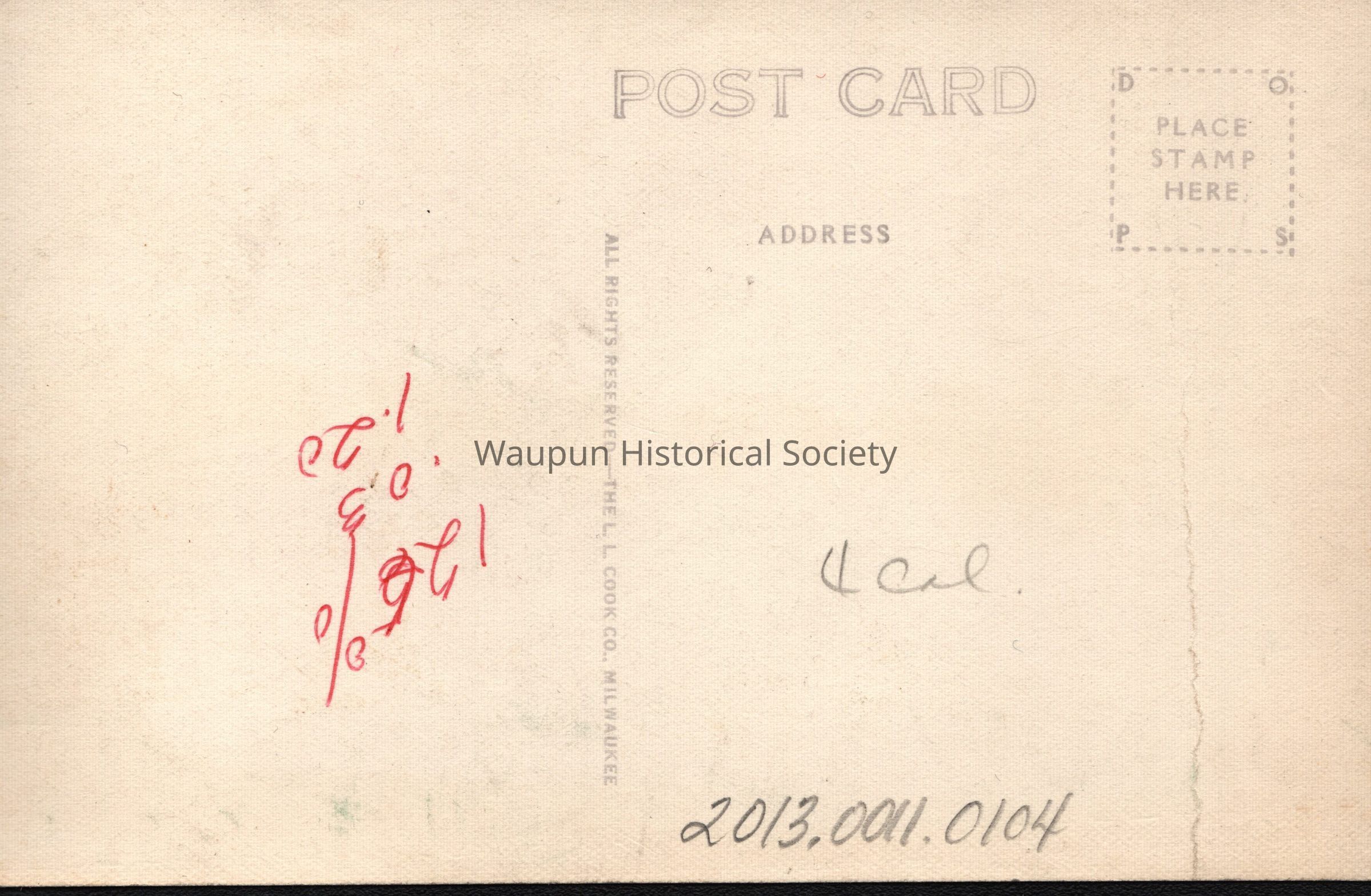 Postcard, City Hall, and Auditorium. Post Card photo from box with collection of Leona Nagler. Appears this to be the Waupun City Auditorium, 1900s.Acquisition