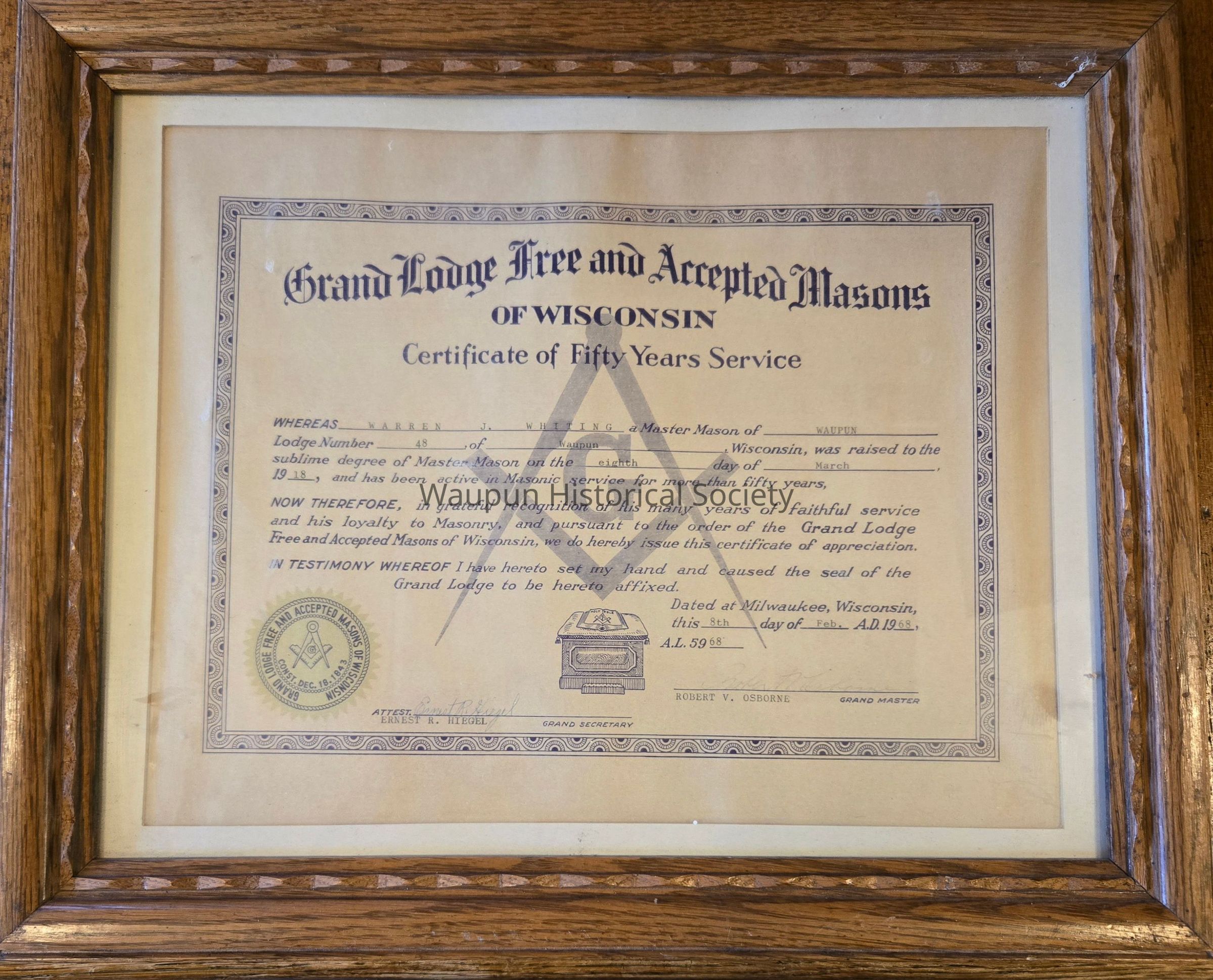 Certificate, Warren Whiting, Grand Lodge Free and Accepted Masons, 50 Years Service