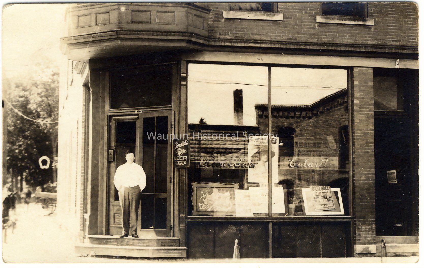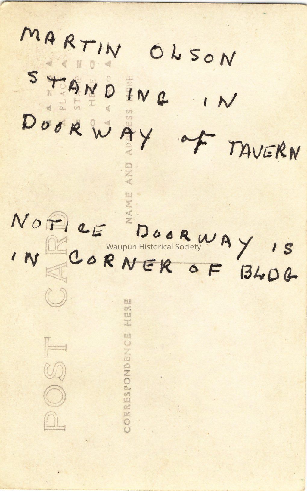 Photo Post Card of a tavern where Martin Olson is standing in the doorway which is in the corner of the building. This was in box with collection from Leona Nagler.Acquisition