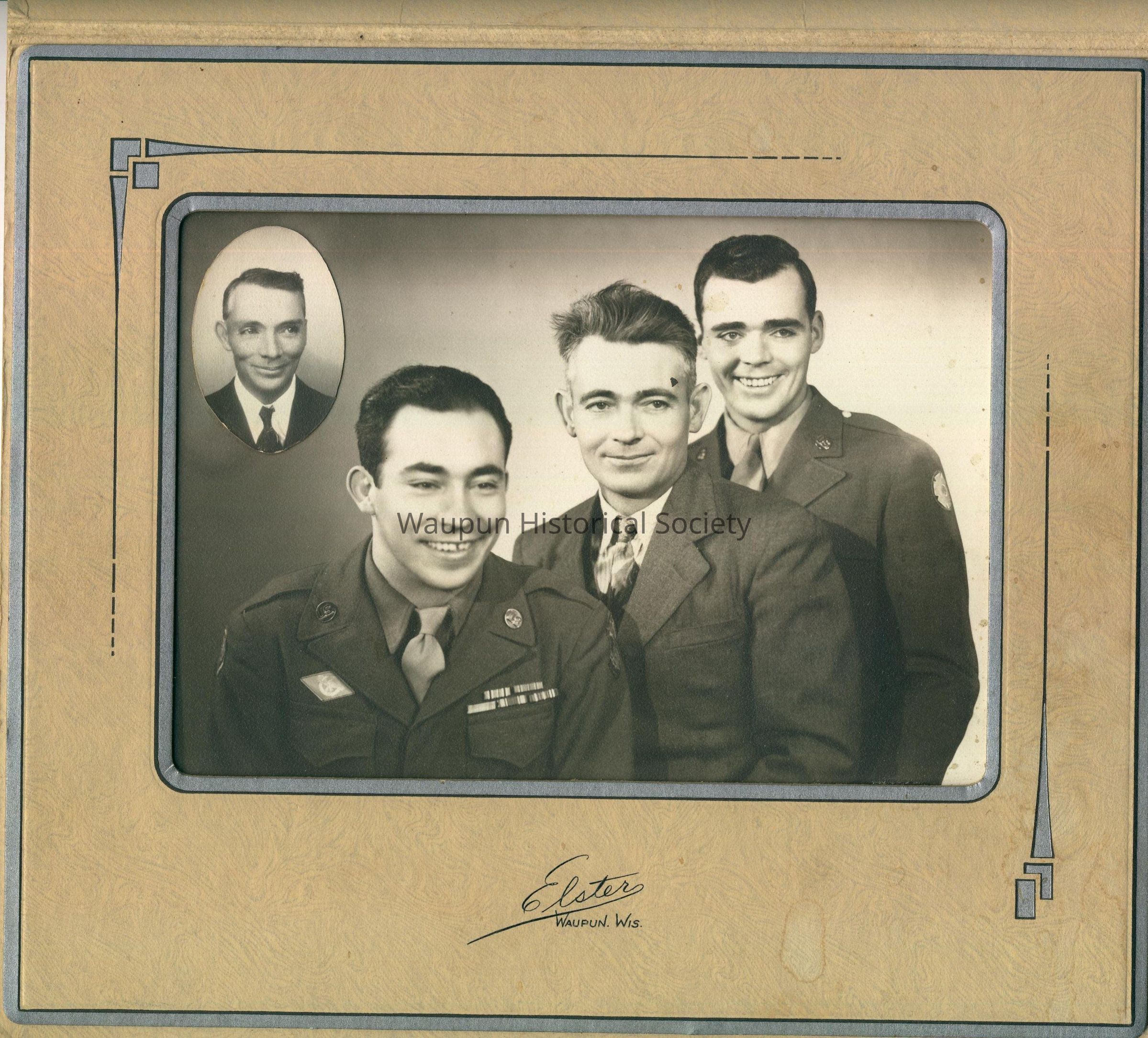 Written on the back indicated that these are four brothers in the Service. In the small photo is Holley Scaggs, from left; John Scaggs, Henry Scaggs, and Howard Scaggs. Their parents were Belle Hardesty and William H. Scaggs. They were the brothers of (Cora Belle)( Scaggs)( Fuller). This picture was taken from Elsters of Waupun, WI.Acquisition