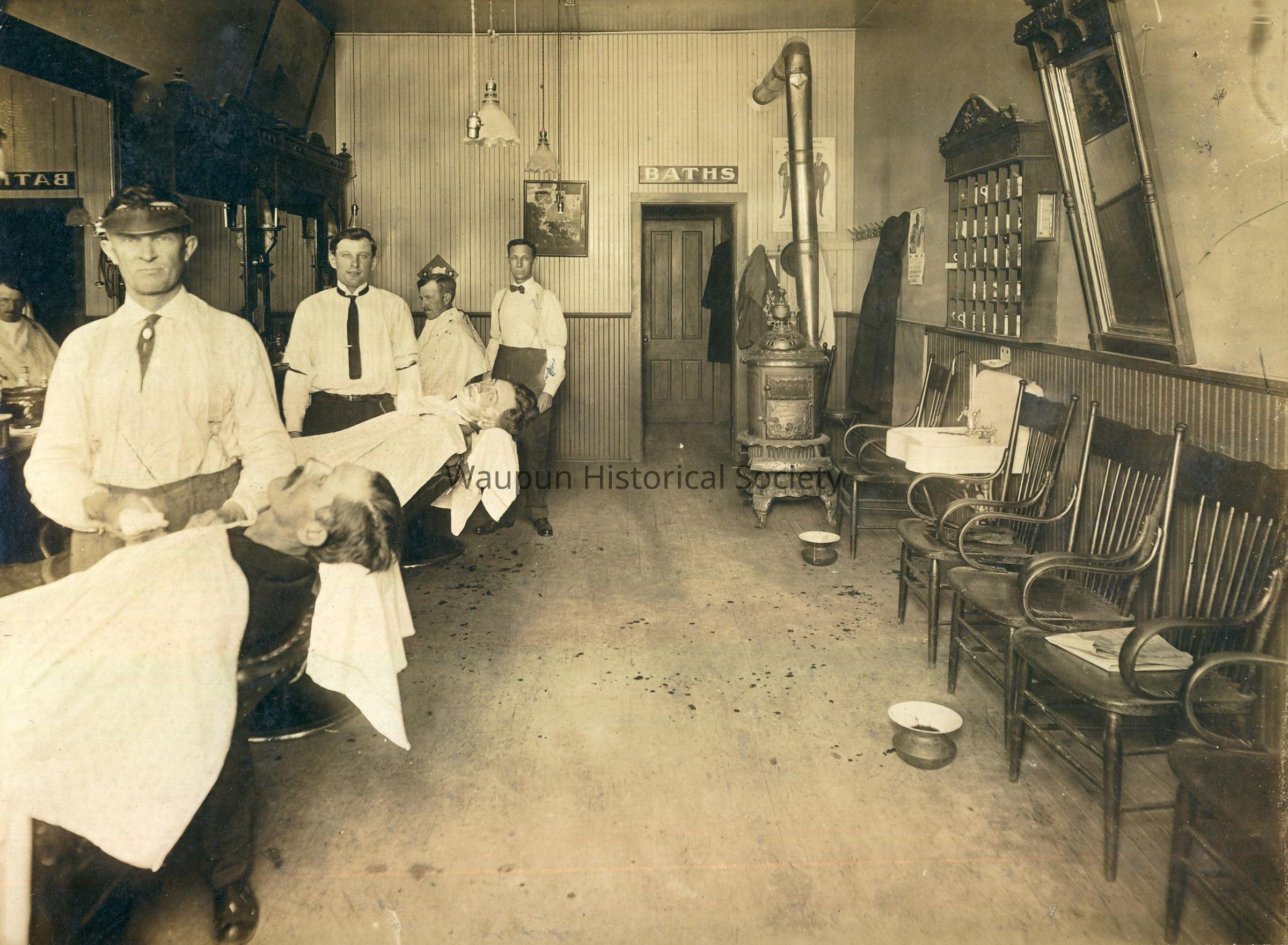 Written on the back indicated that this picture is of Lockhorst Barber Shop. It was taken in 1914. At the first chair is barber Henry Lockhorst, in the chair is Bill Laharky . In the second chair is Bill Hayes , in the third is Tom Fuller and the forth chair is Evert Lockhorst. Note: the sign over the door (BATHS), the pot belly stove, the spittoons on the floor in front of the chairs, the sink with a mirror above and also a mug cabinet. The first barber is wearing a visor probably to keep the glare from the lights above. Note: this is the same as 2007.0003.0011.Acquisition