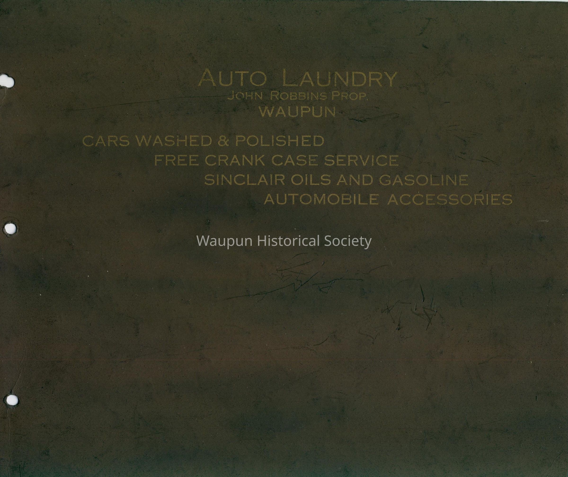 Written on the back indicated that this picture is of the cover of the advertisement for the Auto Laundry Service Station. John Robbins's was the proprietor. At the station they washed and waxed cars, offered free crank case service. The station also had Sinclair oil and gasoline. They also had automobile accessories.Acquisition