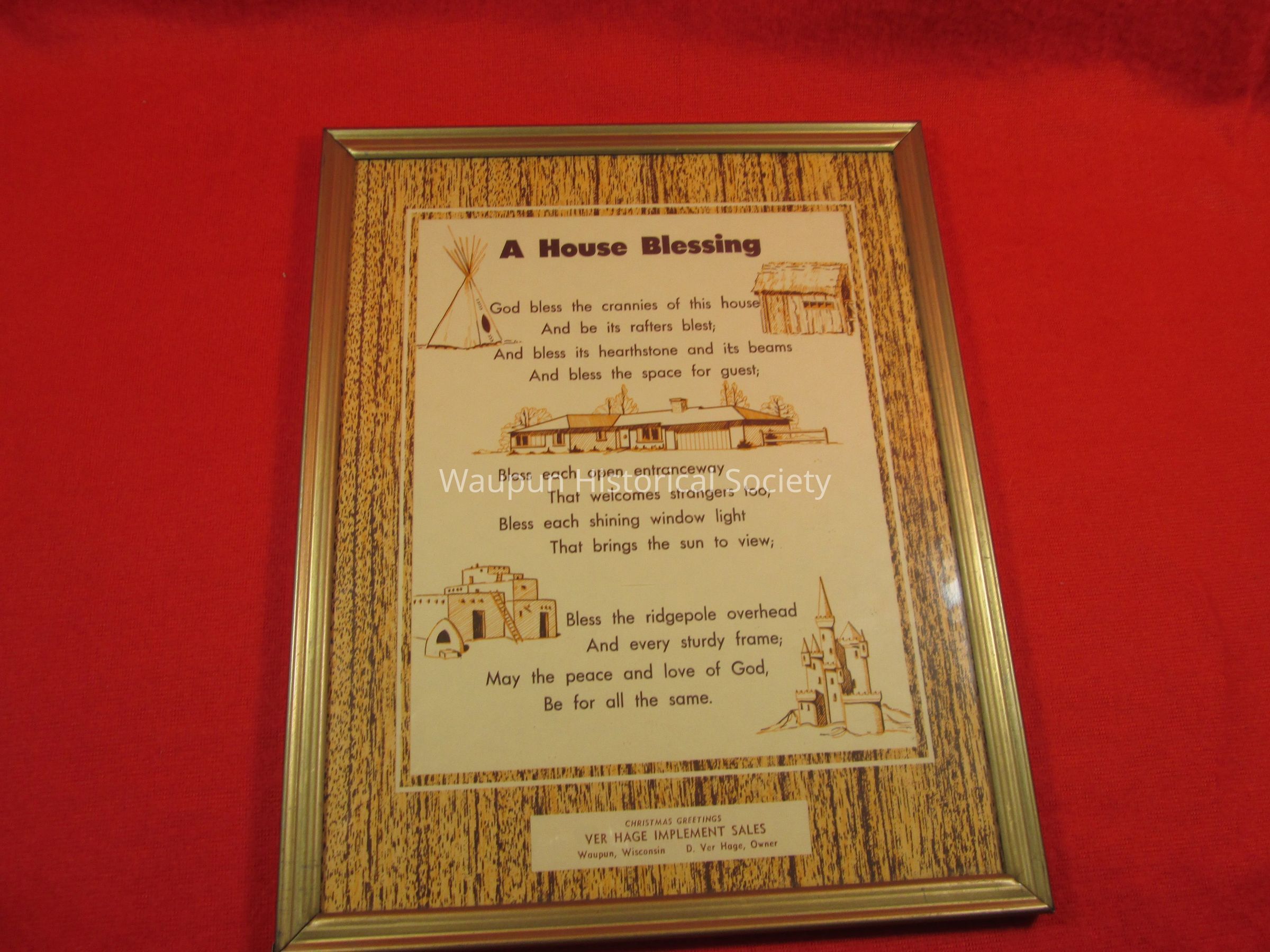 A advertisement of business christmas greeting from ( VERHAGE IMPLEMENT SALES) OF Waupun Wis. a picture of a blessing ( A HOUSE BLESSING) Beige in color.Acquisition