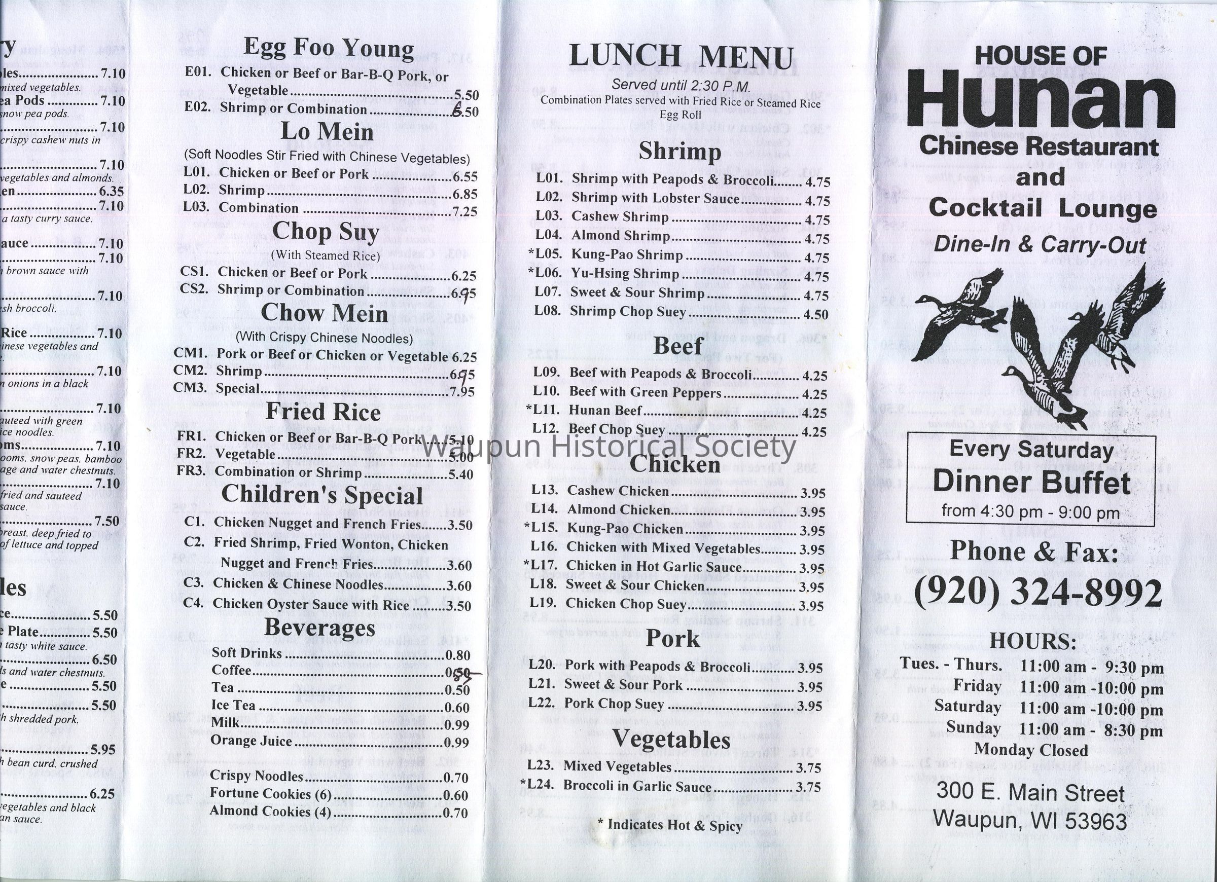 House of Hunan Chinese Restaurant and Cocktail Lounge, Dine-In & Carry-Out. 300 E. Main Street, Waupun, WI 53963. No date given.Acquisition