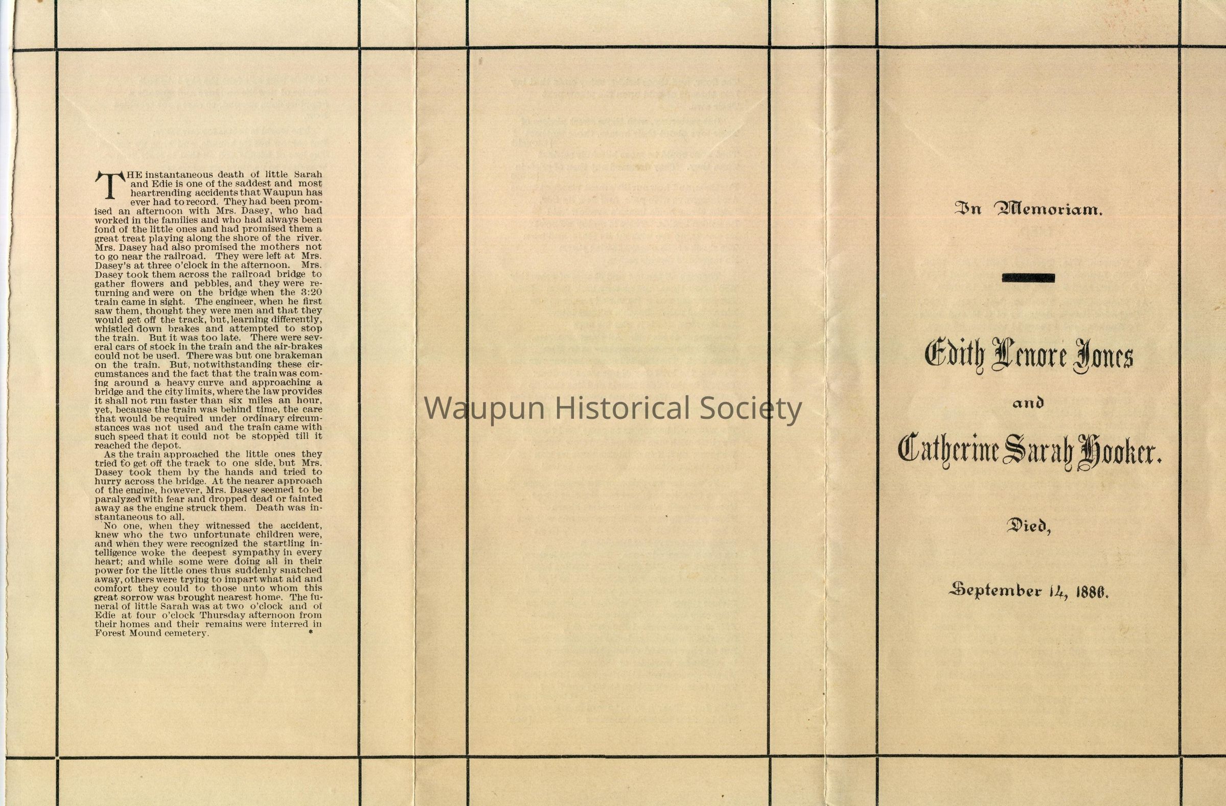 The instantaneous death of little Sarah and Edie is one of the saddest and most heartrending accidents that Waupun has ever had to record. They had been promised an afternoon with Mrs. [Hanora] Dasey, who had worked in the families and who had always been fond of the little ones and had promised them a great treat playing along the shore of the river. Mrs. Dasey had also promised the mothers not to go near the railroad. They were left at Mrs. Dasey's at three o'clock in the afternoon. Mrs. Dasey took them across the railroad bridge to gather flowers and pebbles, and they were returning and were on the bridge when the 3:20 train came in sight. The engineer, when he first saw them, thought they were men and that they would get off the track, but, learning differently, whistled down brakes and attempted to stop the train. But it was too late. There were several cars of stock in the train and the air-brakes could not be used. There was but one brakeman on the train. But, notwithstanding these circumstances and the fact that the train was coming around a heavy curve and approaching a bridge and the city limits, where the law provides it shall not run faster than six miles an hour, yet, because the train was behind time, the care that would be required under ordinary circumstances was not used and the train came with such speed that it could not he stopped till it reached the depot.