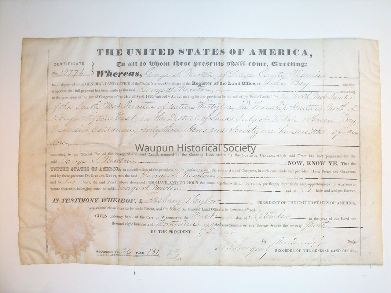 Original Certificate of Land deeded to George S. Newton of Dodge County. Legal description is as follows, " the North West Quarter of the South West quarter of section thirty one, in township fourteen north of range fifteen east in the district of lands subject to sale at Green Bay, Wisconsin, containing forty three acreas and seventy one hundreth of an acre. Reportedly sign by President Zachary Taylor, Sept. 1, 1849.