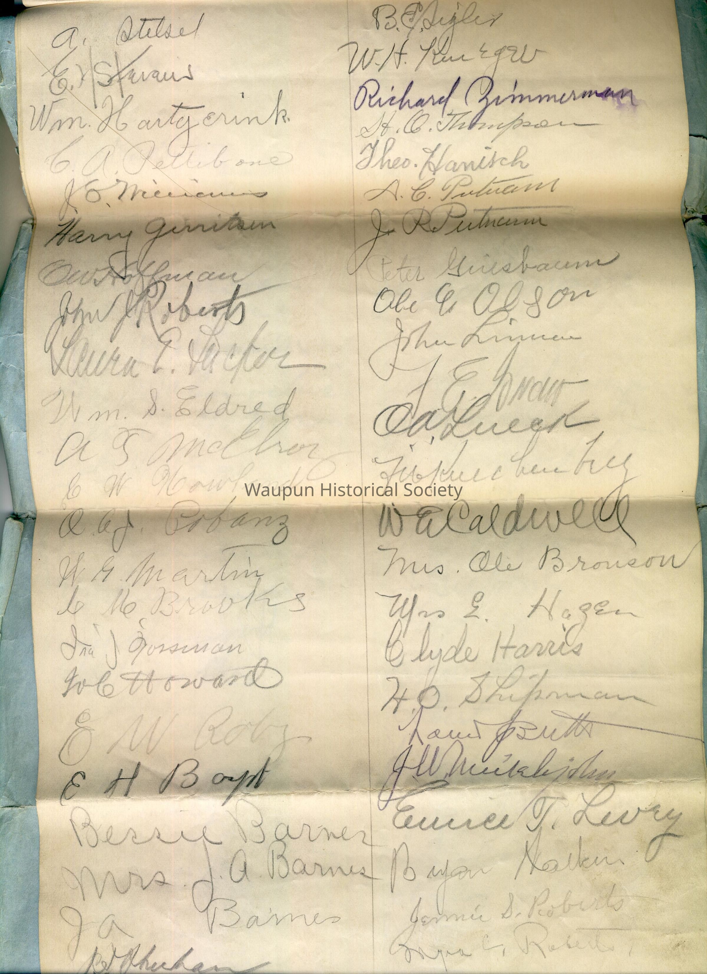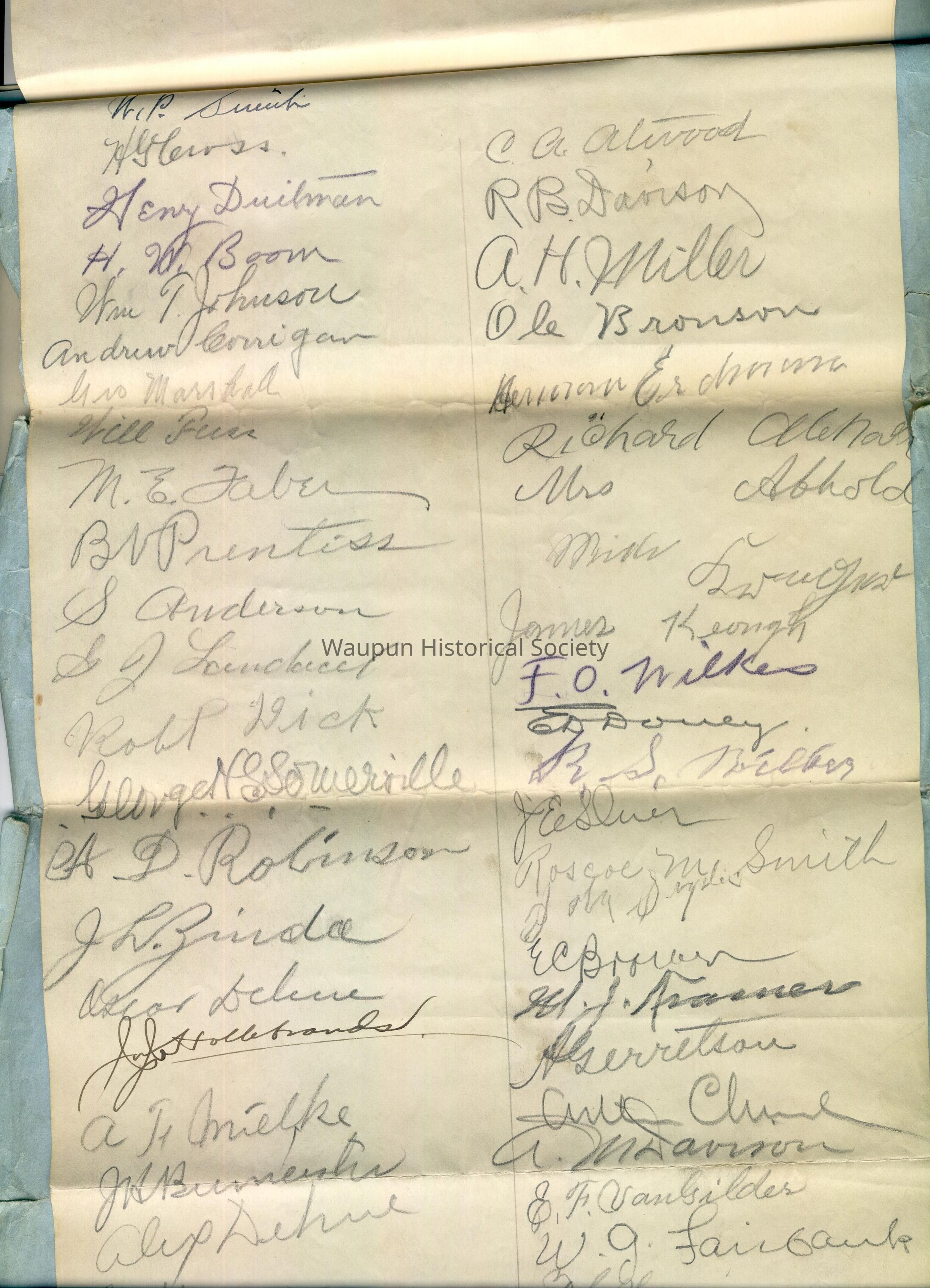 Parks, Wilcox, Cemetery, Old Waupun Cemetery. To the Common Council of the City of Waupun, dated Waupun, Wis. August 5th, 1914. The undersigned citizens of the City of Waupun and residents thereof, petition your body, to take such steps as may be legal or necessary, by securing a legislative act if required, for the vacating of the old Waupun Cemetery, corner of East Lincoln and South Watertown streets, and the removal of the remains therein to some proper place for reinterment. Original signatures plus early photograph of what the cemetery looked like, taken from the corner of Watertown and Lincoln streets, approximately 1915. Many early residents have their signatures on this petition.Acquisition