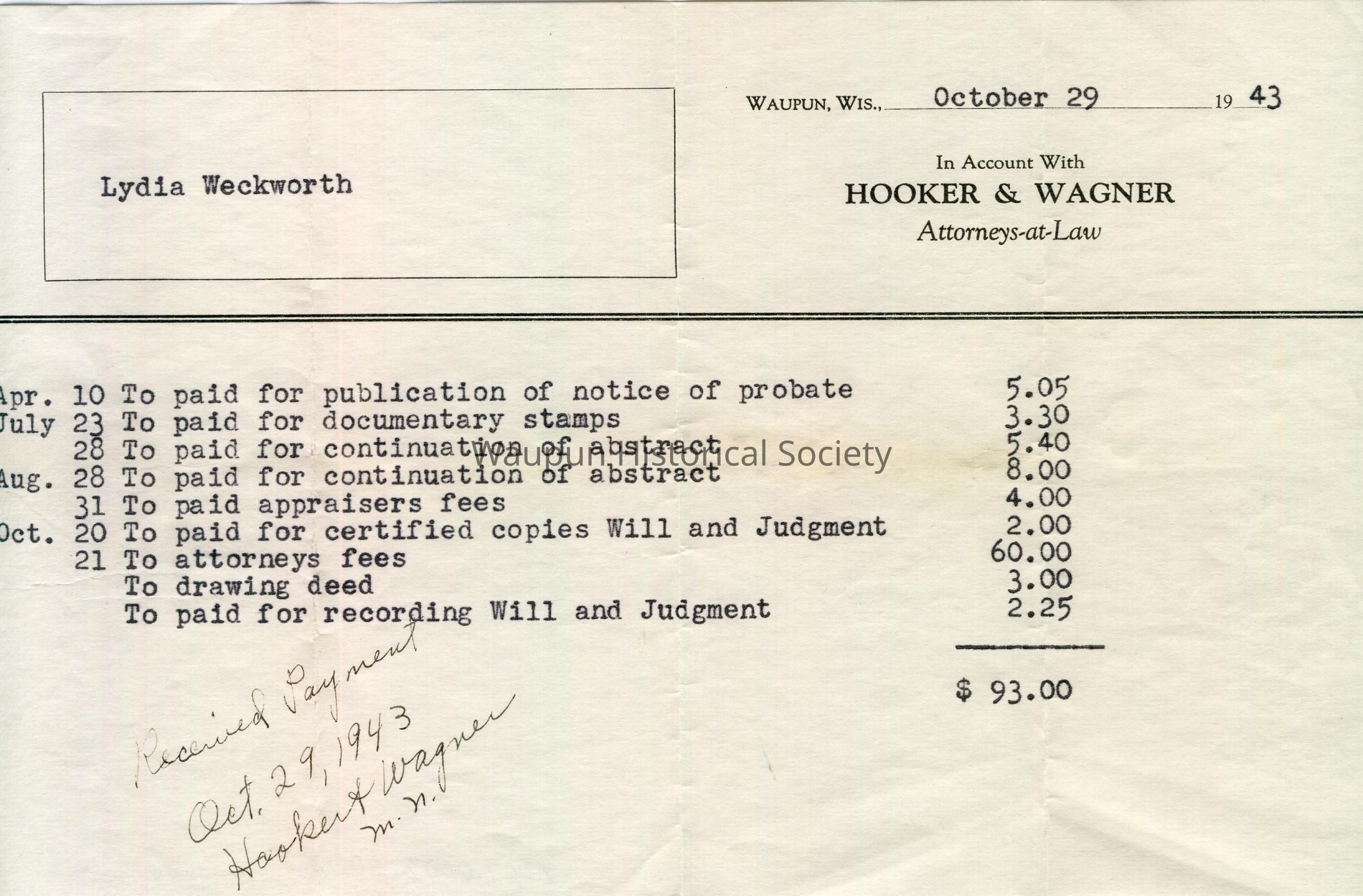 Notice of Probate and fees in account with Hooker & Wagner, Attorneys-at-Law. Dated Waupun, Wis., October 29, 1943. This may have been for her mother's will. (Mrs. E. Weckman) No father's name was given.