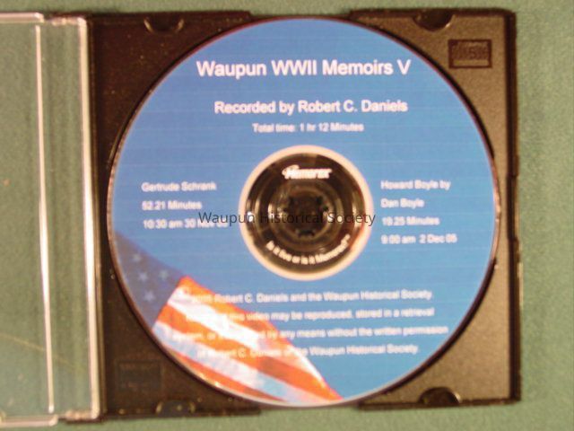 WWII Recordings: Recorded interviews / memoirs of Waupun WWII Veterans, recorded by Robert C. Daniels and donated to the Waupun Historical Society..Originals are stored at City Hall, Copies are stored on main floor near DVD player.