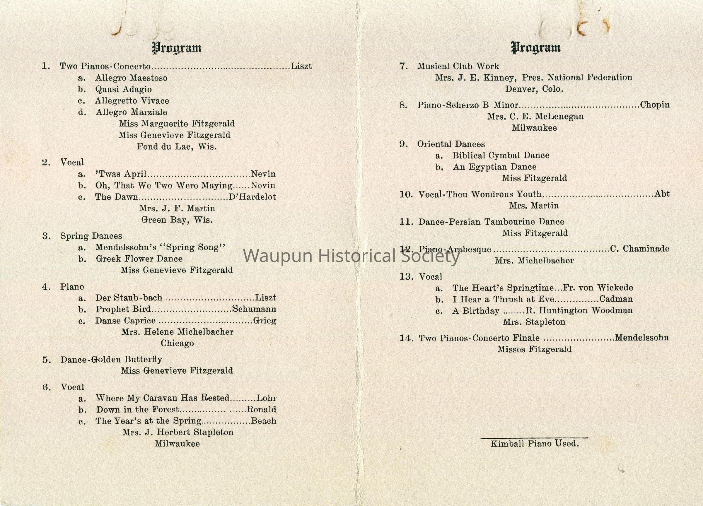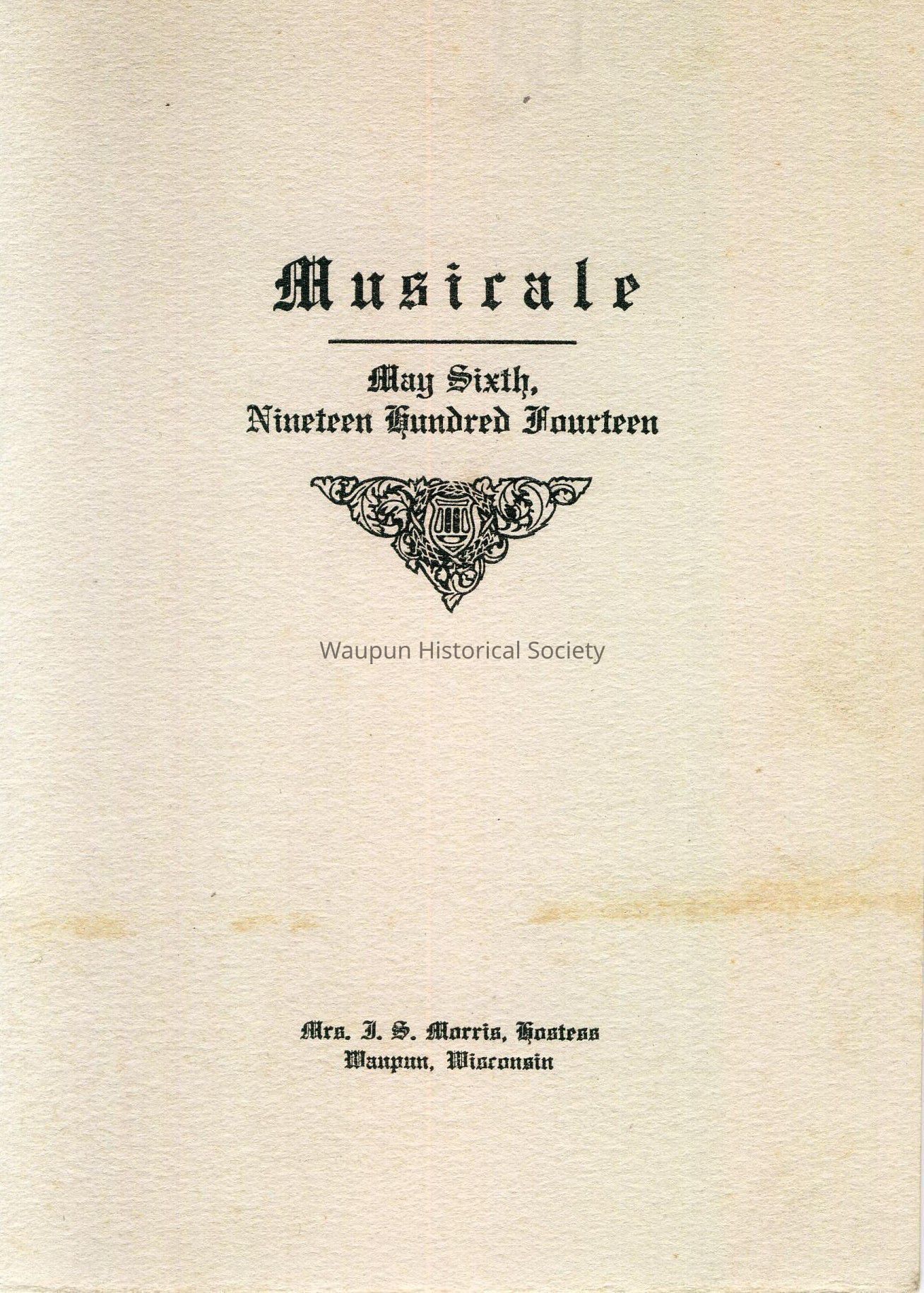 Waupun Philharmonic Music Club. Musicale, May 6, 1914. Mrs. J. S. Morris, hostess, Waupun, Wisconsin.