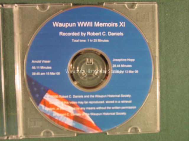 WWII Recordings: Recorded interviews / memoirs of Waupun WWII Veterans, recorded by Robert C. Daniels and donated to the Waupun Historical Society.Originals are stored at City Hall, Copies are stored on main floor near DVD player.