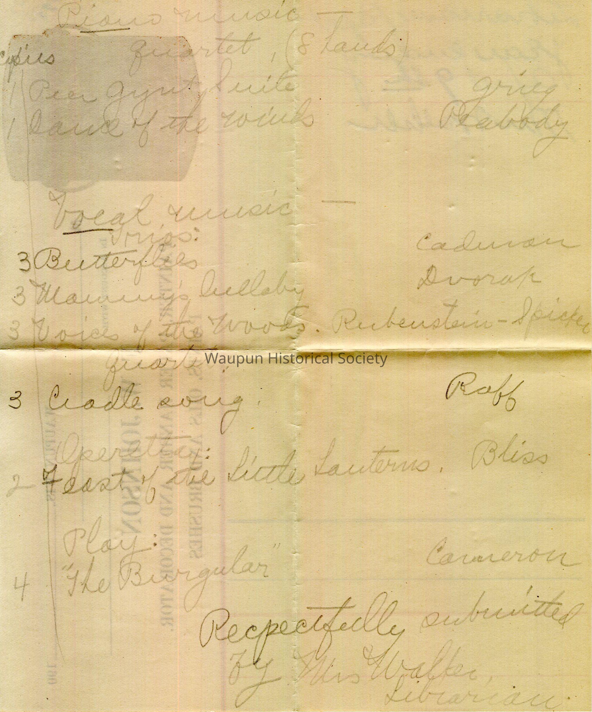 Philharmonic Music Club of Waupun, Wisconsin, Librarians Report, Year Ending April 9th, Mrs. [Louis] Walker (no year given but found with other April 9, 1917, items).