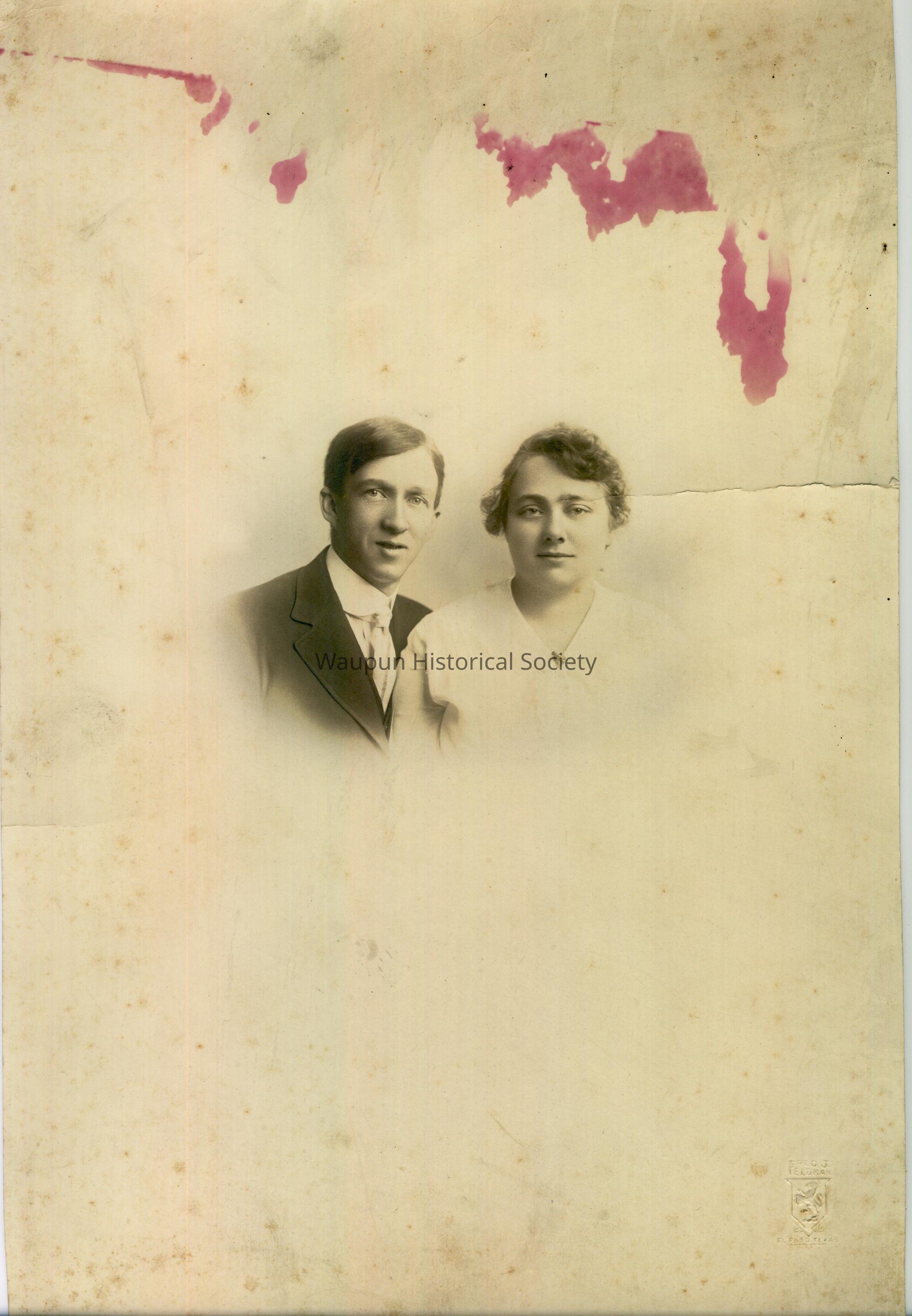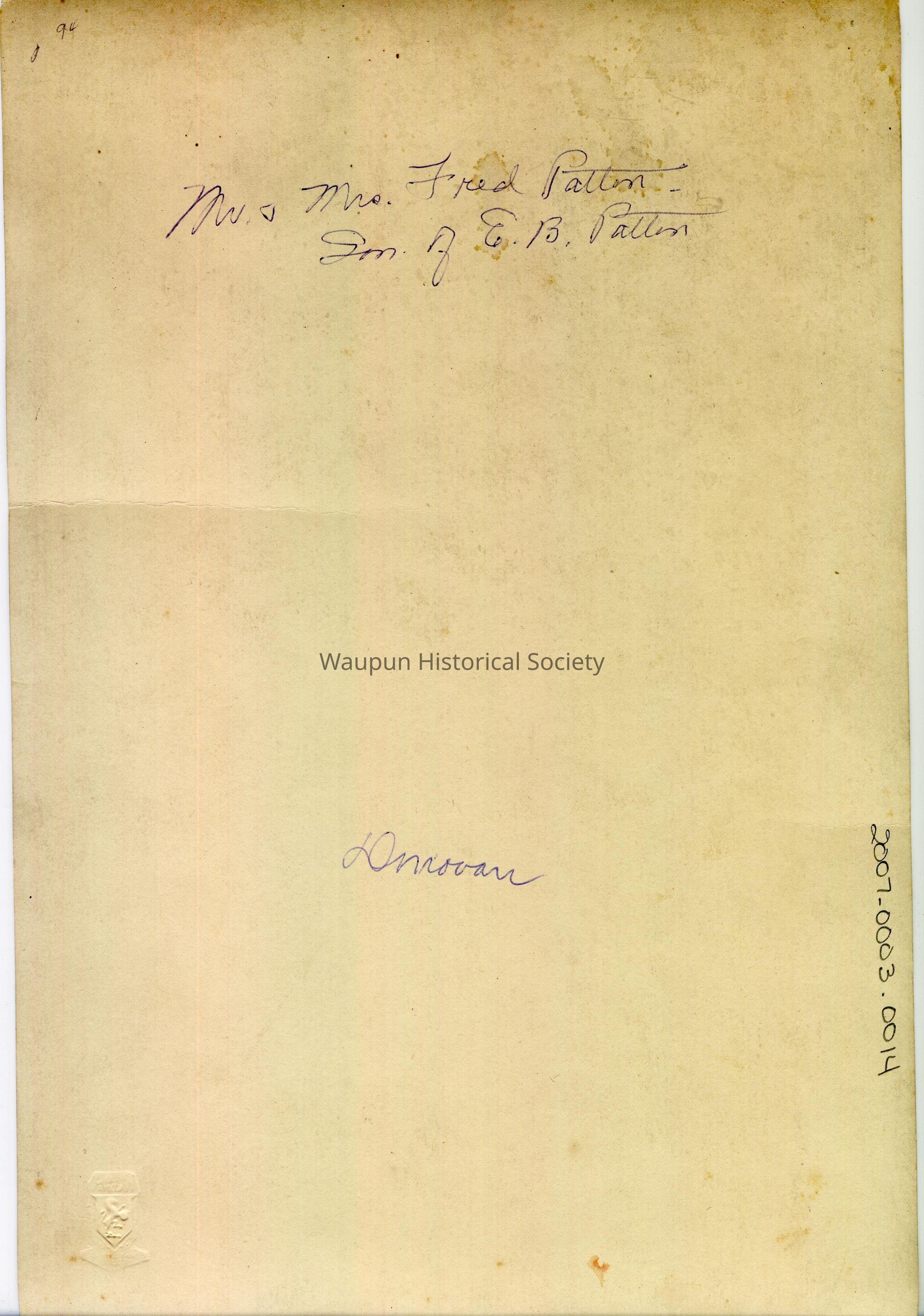 Photo found in an unidentified box in the Waupun Heritage Museum work room. Please contact the Waupun Heritage Museum at 22 S. Madison St. Waupun, WI 53963. Phone No. 920-324-7931. This is a photo of Mr. and Mrs. Fred Patton. On the back of the photo says he is the son of E. B. Patton. Also on the back of the photo mentions Donovan.Acquisition