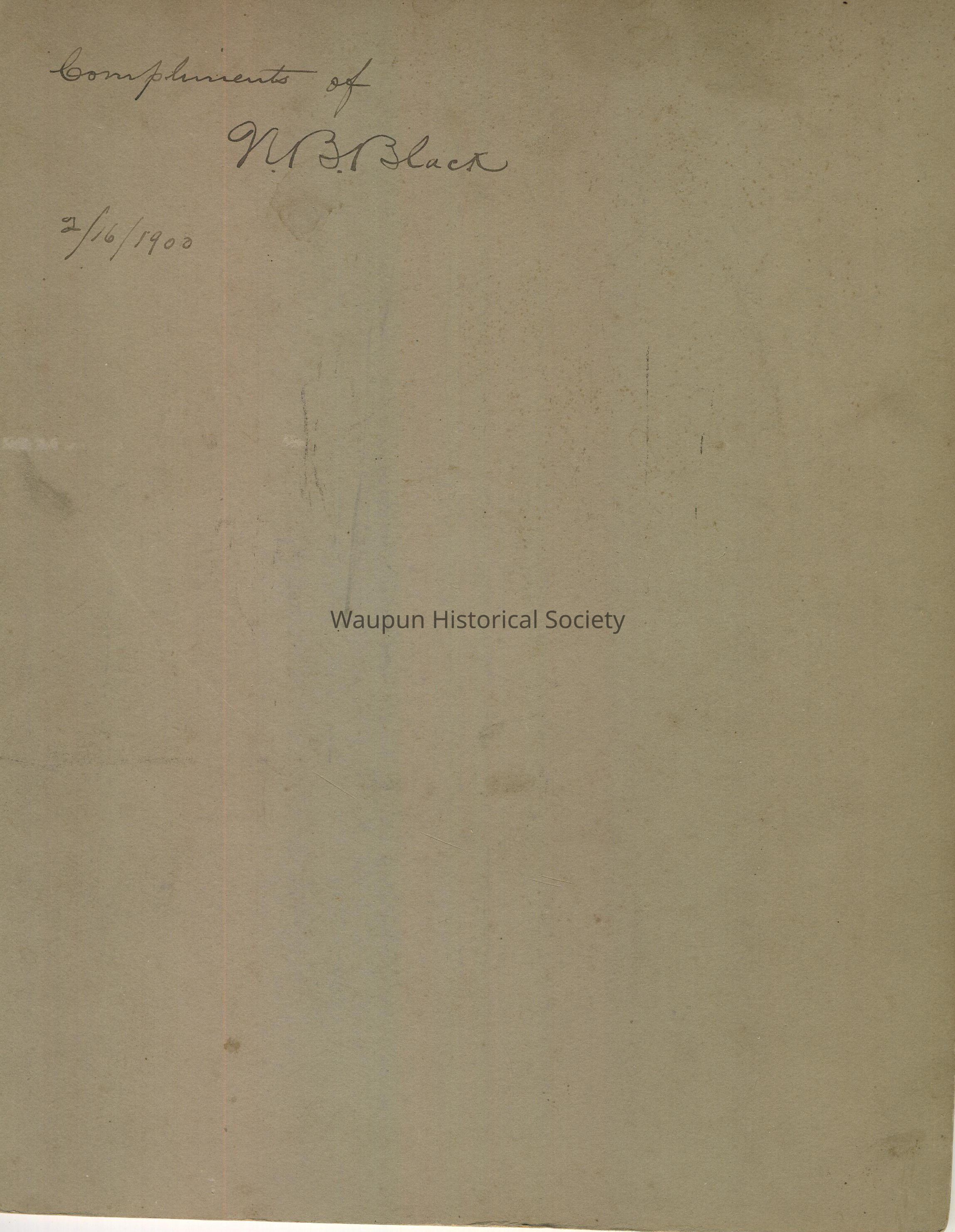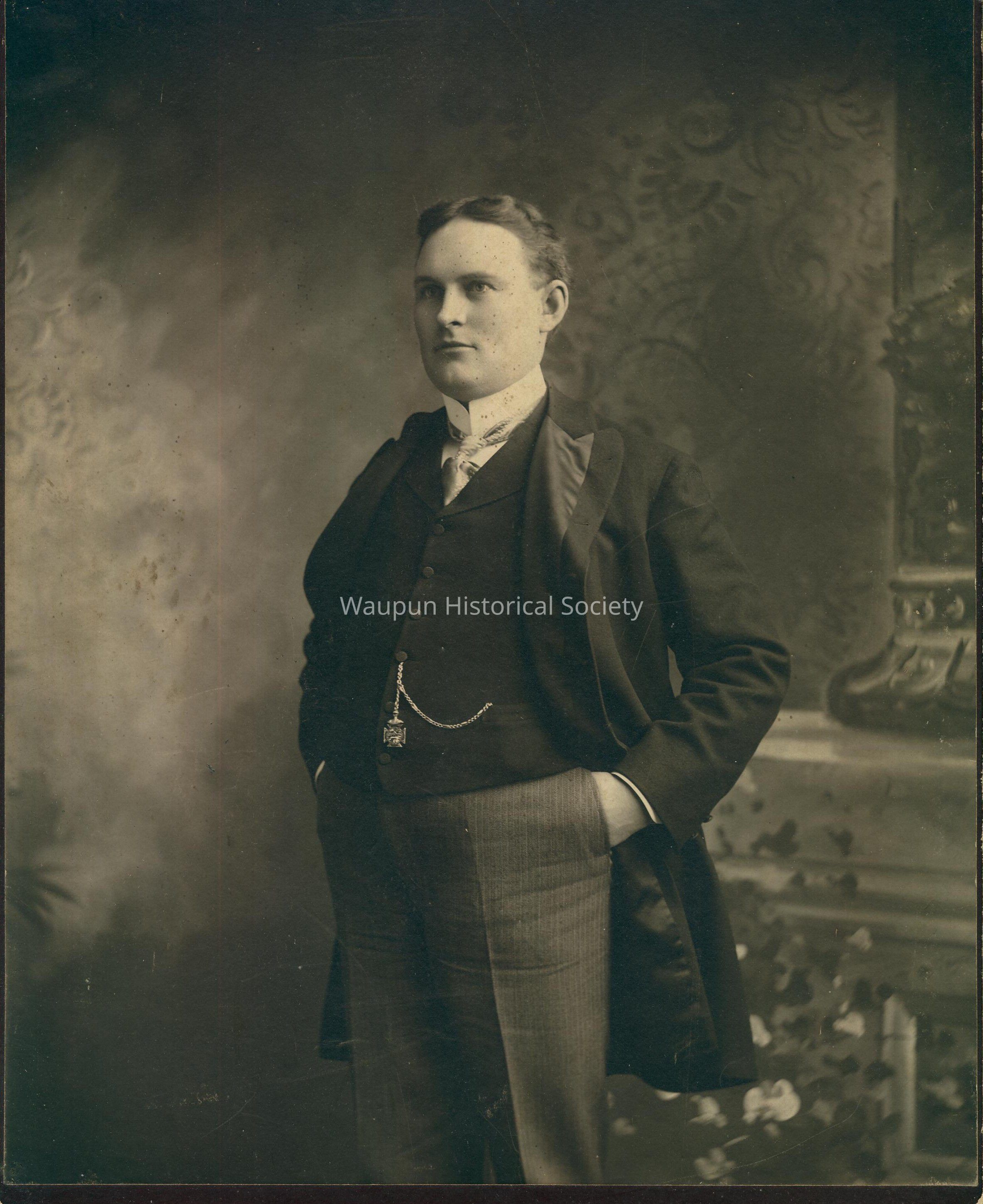 Portrait, found in an unidentified box in the Waupun Heritage Museum work room. Please contact the Waupun Heritage Museum at 22 S. Madison St. Waupun, WI 53963. Phone No. 920-324-7931. This is a photo of a young gentlemen in his suit coat and a emblem from his watch in his pocket hanging out in front of his vest. On the back of this photo says, Compliments of N. B. Black with a date of 2/16/1900.Acquisition