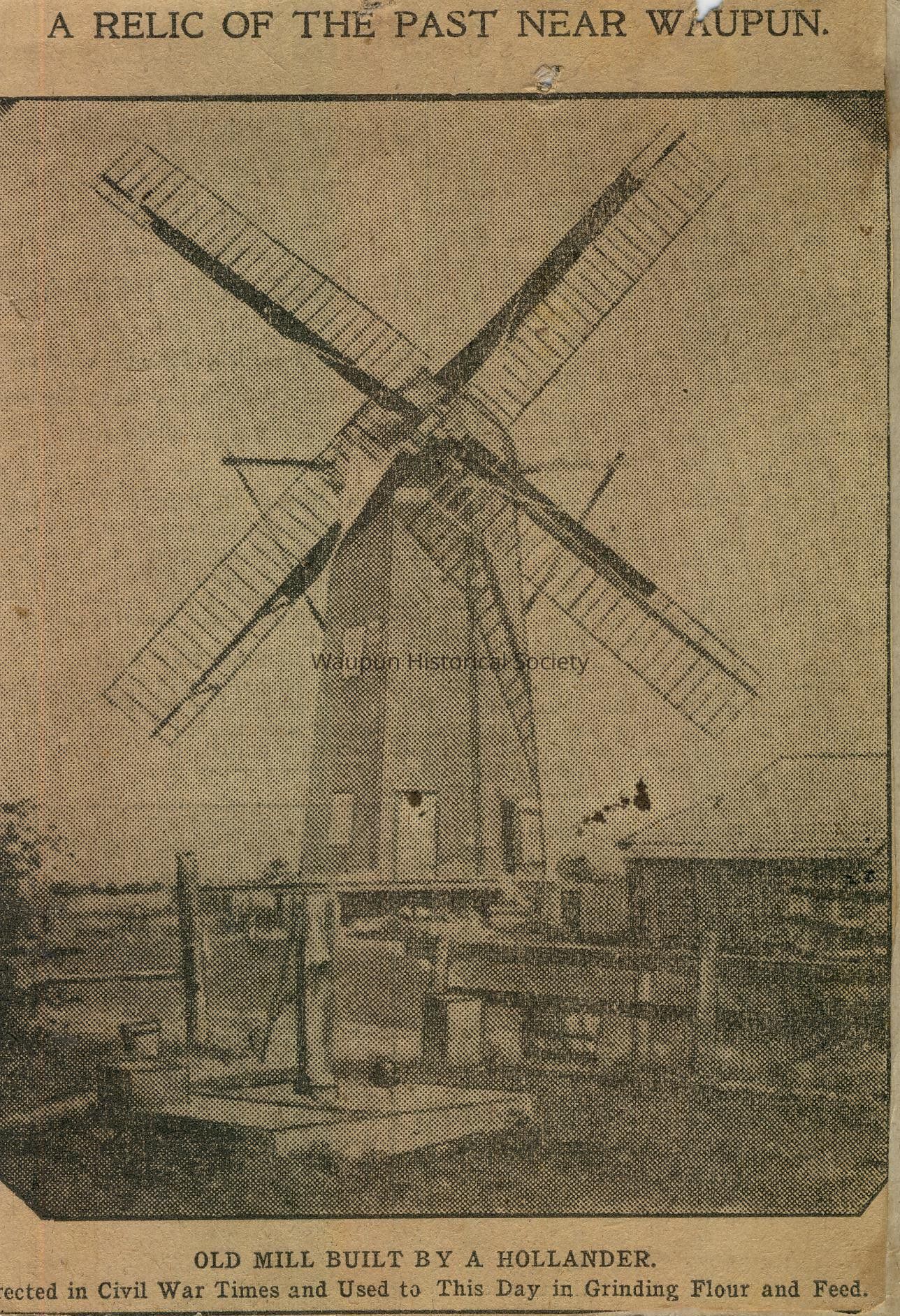 Photograph, found in an unidentified box in the Waupun Heritage Museum work room. Please contact the Waupun Heritage Museum at 22 S. Madison St. Waupun, WI 53963. Phone No. 920-324-7931. This is a picture of the Old Mill in Waupun. On the top it says that it is "A RELIC OF THE PAST NEAR WAUPUN." On the bottom of the photo is mentioned that the Old Mill was built by a Hollander. It was erected in Civil War times and used to this day in grinding, flour and feed.Acquisition