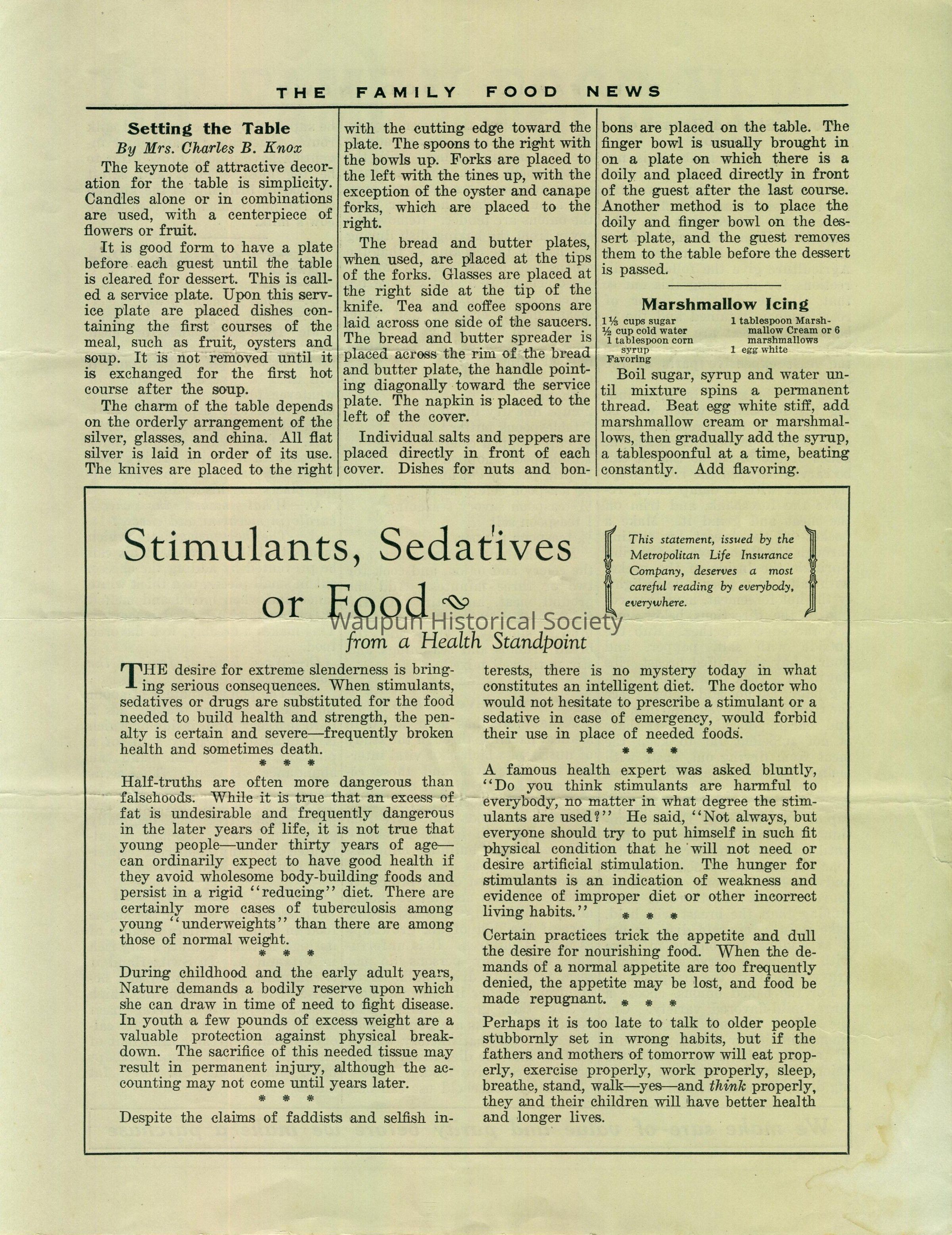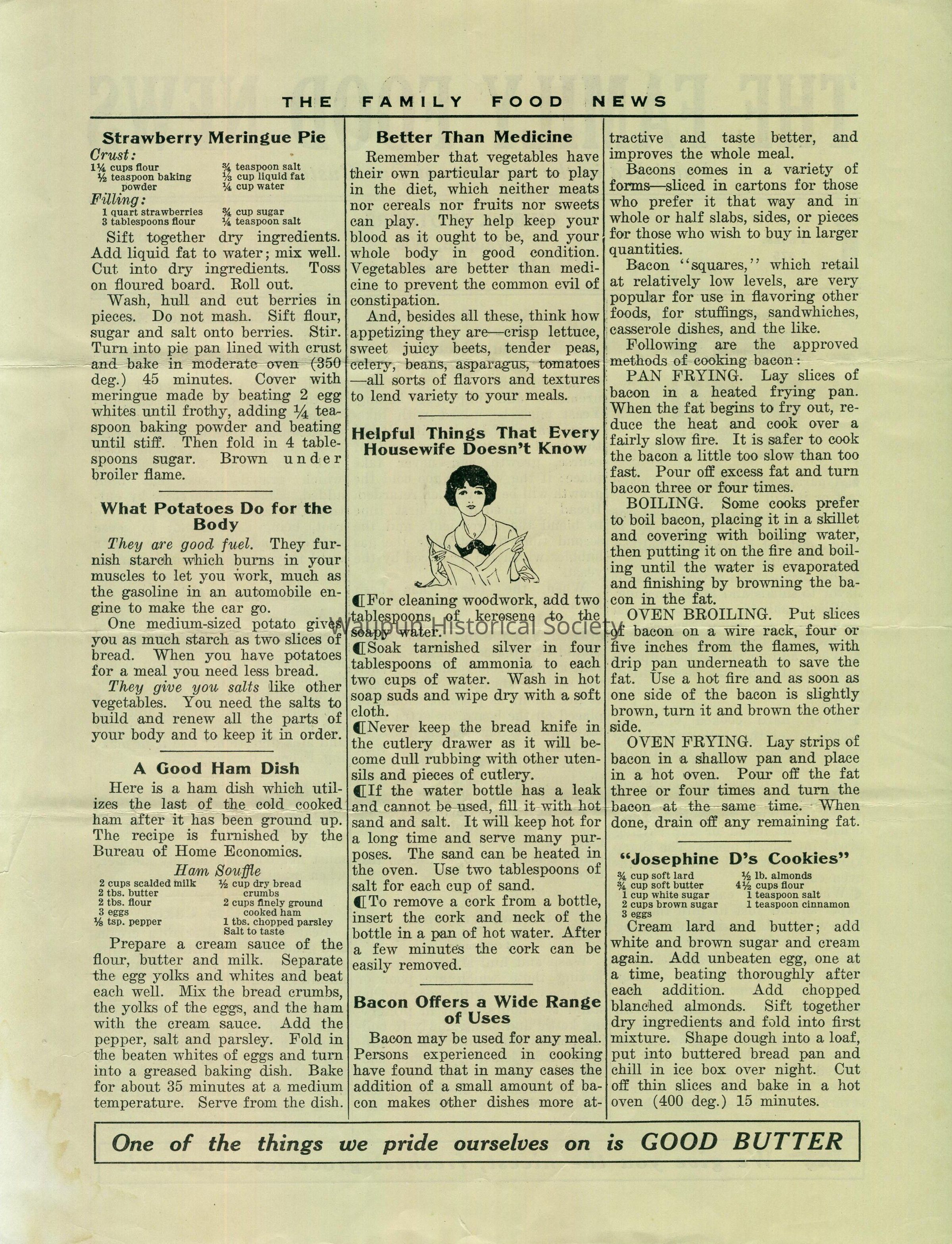 Contains recipes, helpful hints and other tidbits of interest to the housewife.