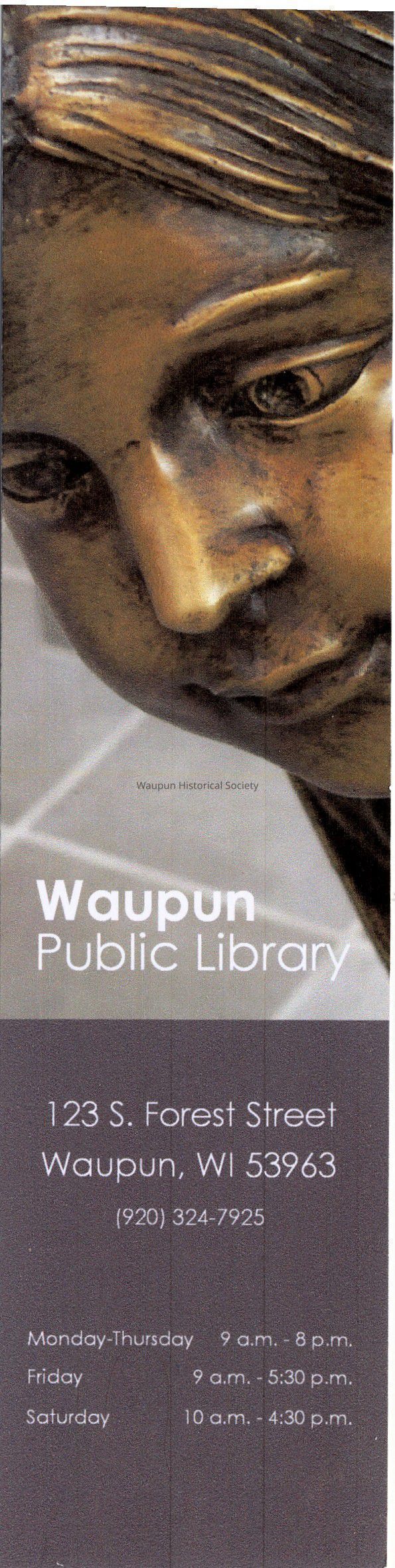 Bookmark, Library. Bookmark from the Waupun Public Library. These were handed out with the opening of the new library.Acquisition