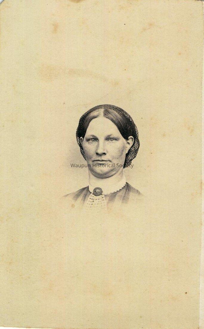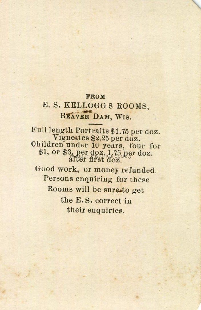 Cabinet Card, Small, found in an unidentified box in the Waupun Heritage Museum work room. Please contact the Waupun Heritage Museum at 22 S. Madison St. Waupun, WI 53963. Phone No. 920-324-7931. This is a picture of a young lady, whose name is not mentioned. On the back of this photo is written "from E.S. KELLOGGS ROOMS, Beaver Dam, Wis. Full length Portraits $1.75 per doz. Vignettes $2.25 per doz. Children under 10 years, four for $1, or $3. per doz. 1.75 per doz. after first doz. Goo work, or money refunded. Persons enquiring for these Rooms will be sure to get E. S. correct in their enquiries.Acquisition