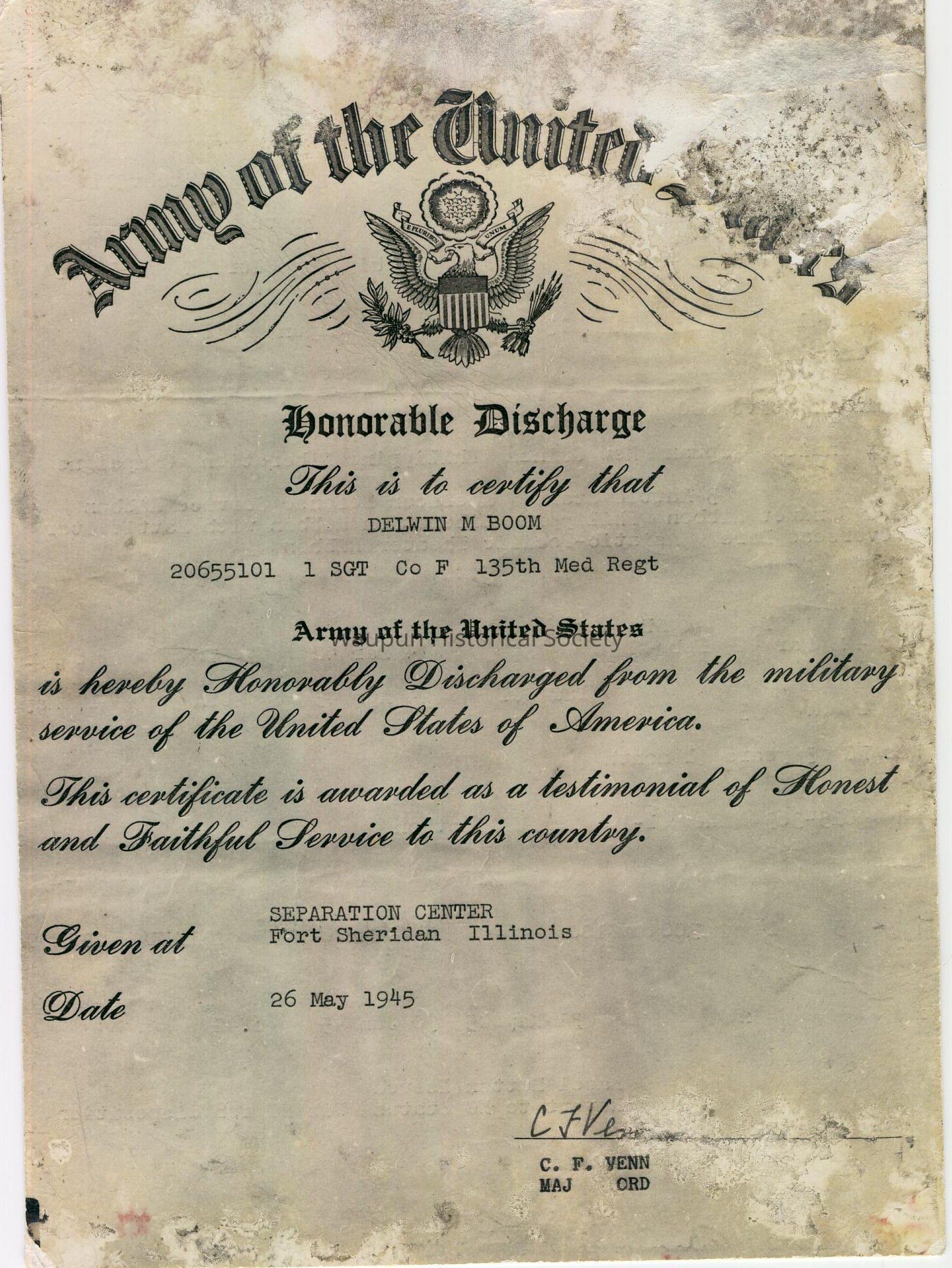 This is a Honorable Discharge Certificate for Delwin Merril Boom.