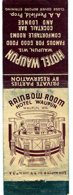 Matchbook cover from the Rainbow Room in the Hotel Waupun. The Hotel Waupun was at 222 E. Main Street in Waupun. As of 2008 the site is a parking lot for the National Bank, the hotel was razed. The bar looked much like the picture, round with doors on both sides. As you look at the bar in the picture there was a small dinning room behind you and in a larger room behind these rooms was a larger dinning room.