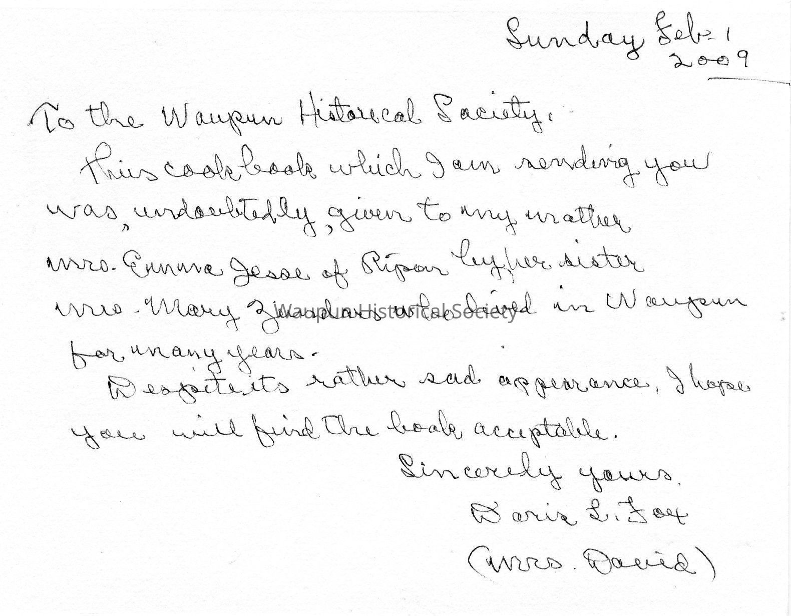 This cookbook which I am sending you was undoubtley given to my mother Mrs. Ermma Jesse of Ripon by her sister Mrs. Mary Zeindars who lived in Waupun for many years.