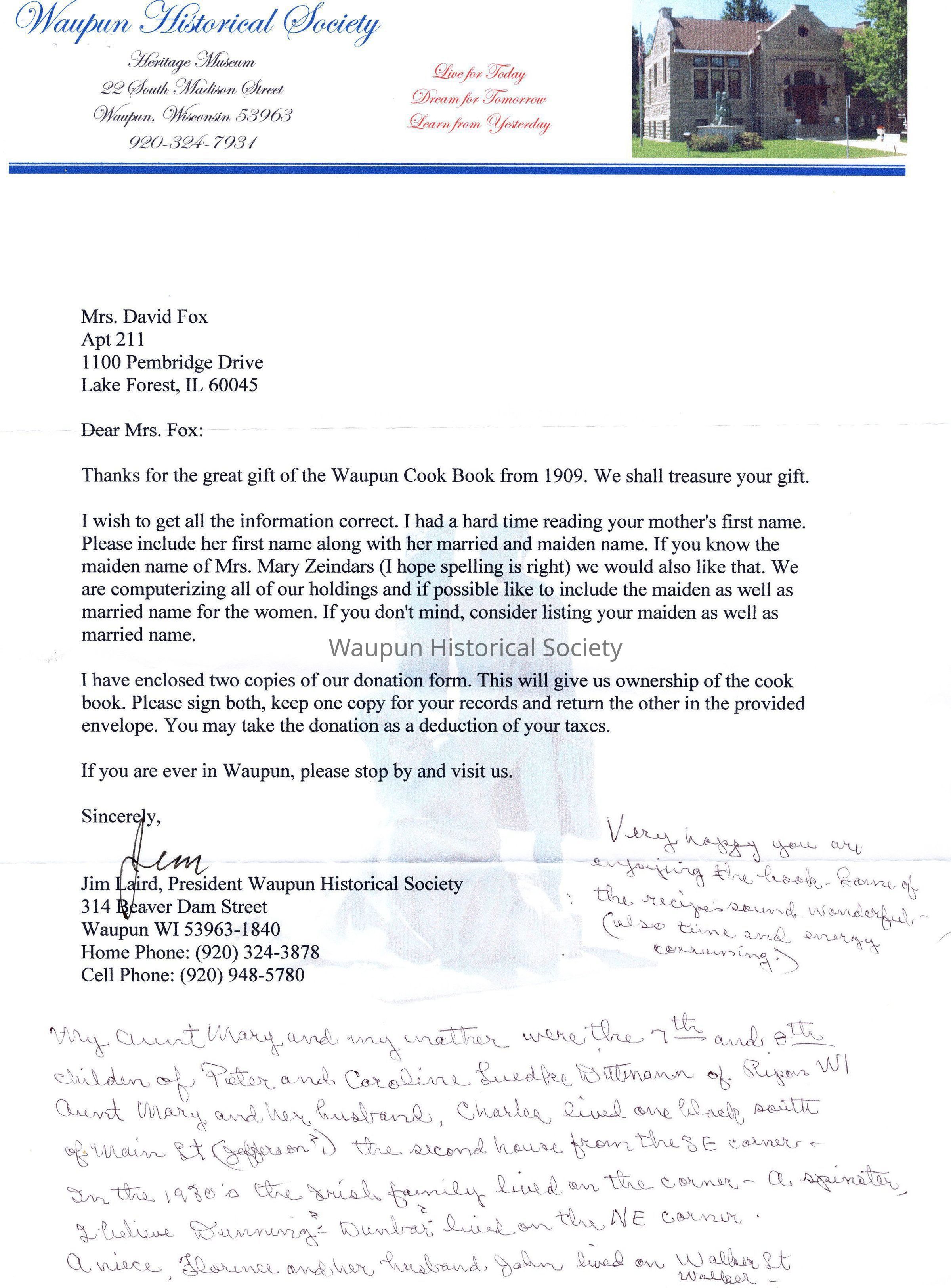 Thanks for the great gift of the Waupun Cook Book from 1909. We shall treasure your gift.