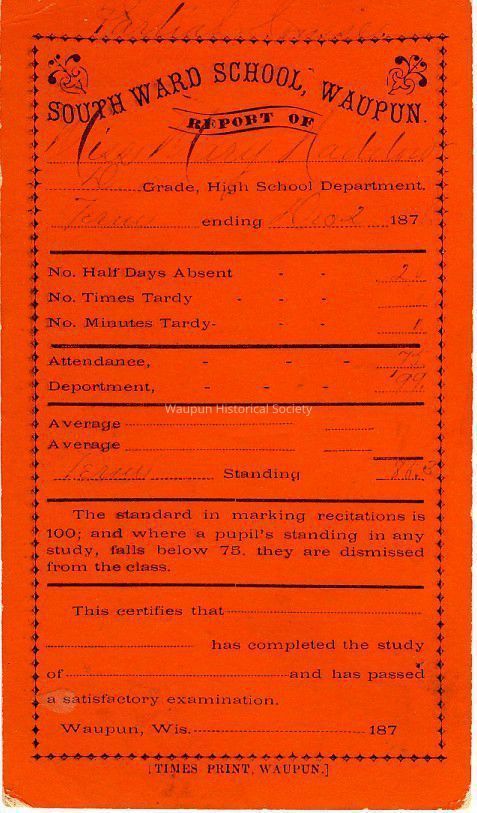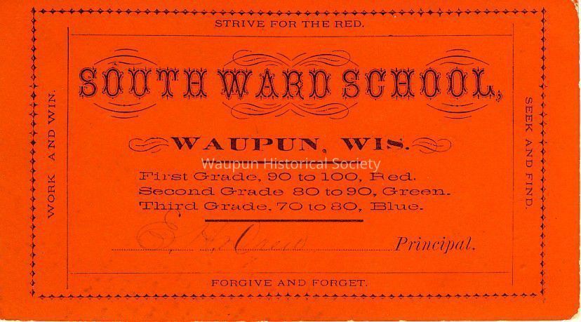 Attendance Report Card, South Ward School in WaupunEntry/Object ID