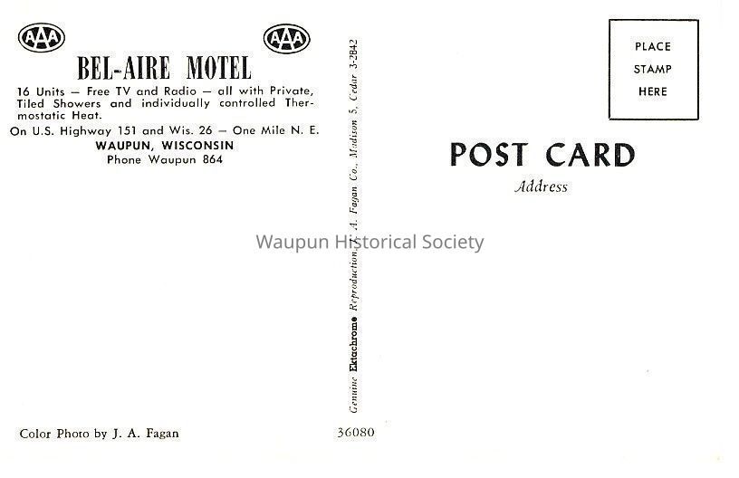 Postcard advertising the Bel - Aire Motel just north of Waupun on highways 151 and 26.