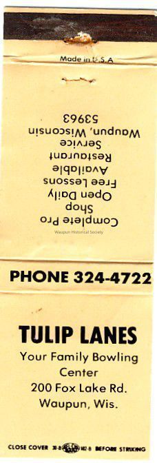 Matchbook from Tulip Lanes in Waupun. Waupun converted to dial in 1961, considering the phone number on the matchbook, this is after this date. The building was vacated and became the