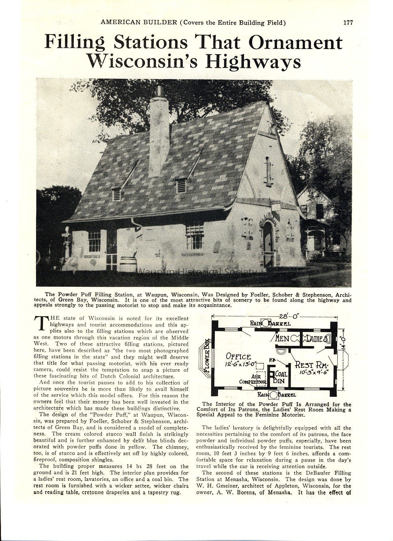 Article taken from the American Builder explaining the Powder Puff filling station in Waupun. The article is dated January 1927. The Powder Puff filling station was located at the intersection of Fond du Lac and Watertown steets.